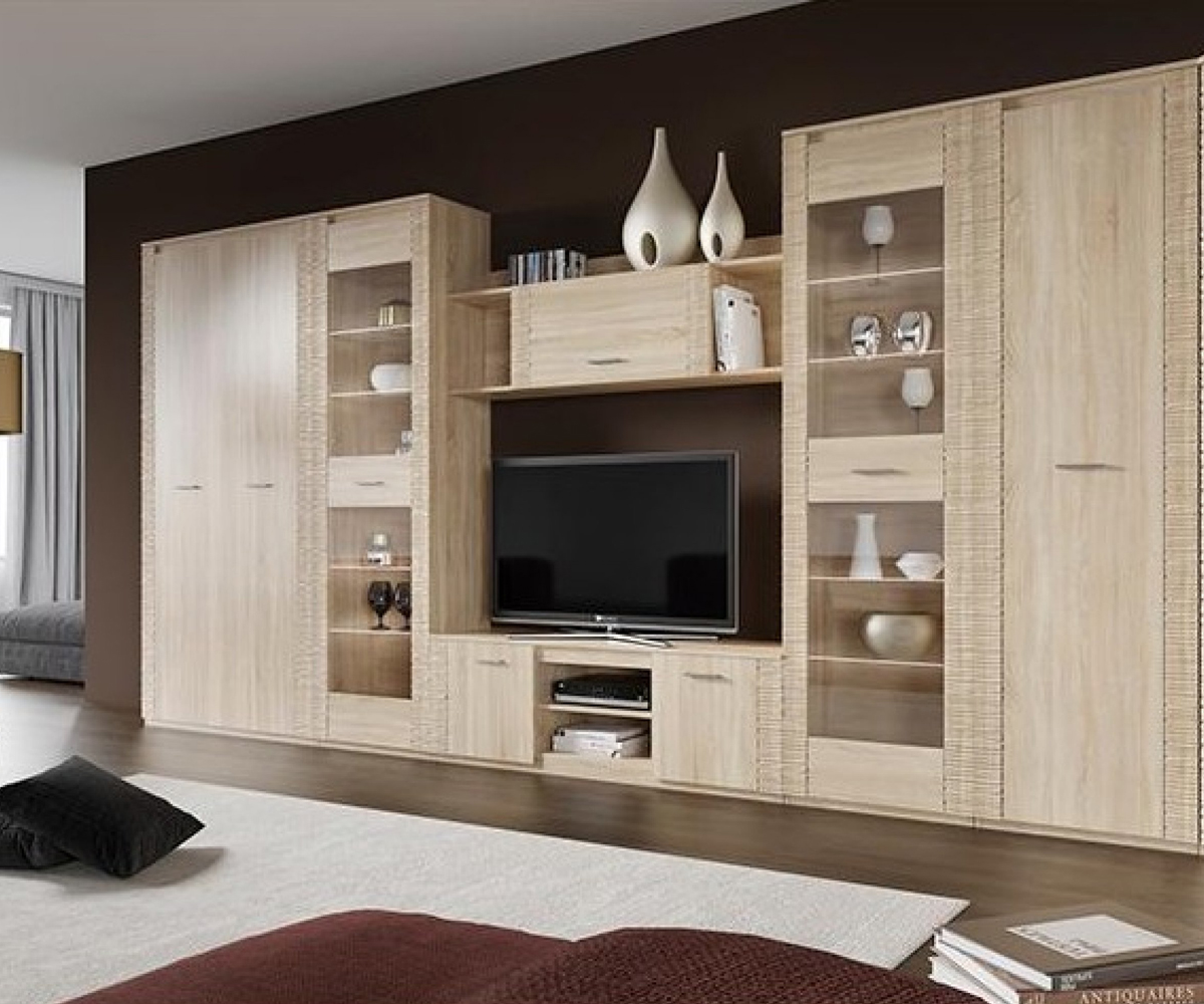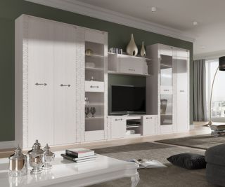 Гостиная «Элана» обязательно покорит любителей минимализма и сторонников практичности, ведь она может комплектоваться по Вашему желанию различными шкафами достаточной вместимости и полками, на которых удобно разместятся и важные мелочи, и элементы декора. Располагаться элементы гостиной «Элана» могут различным образом, что придаст помещению, в котором она будет находиться, неповторимый вид.