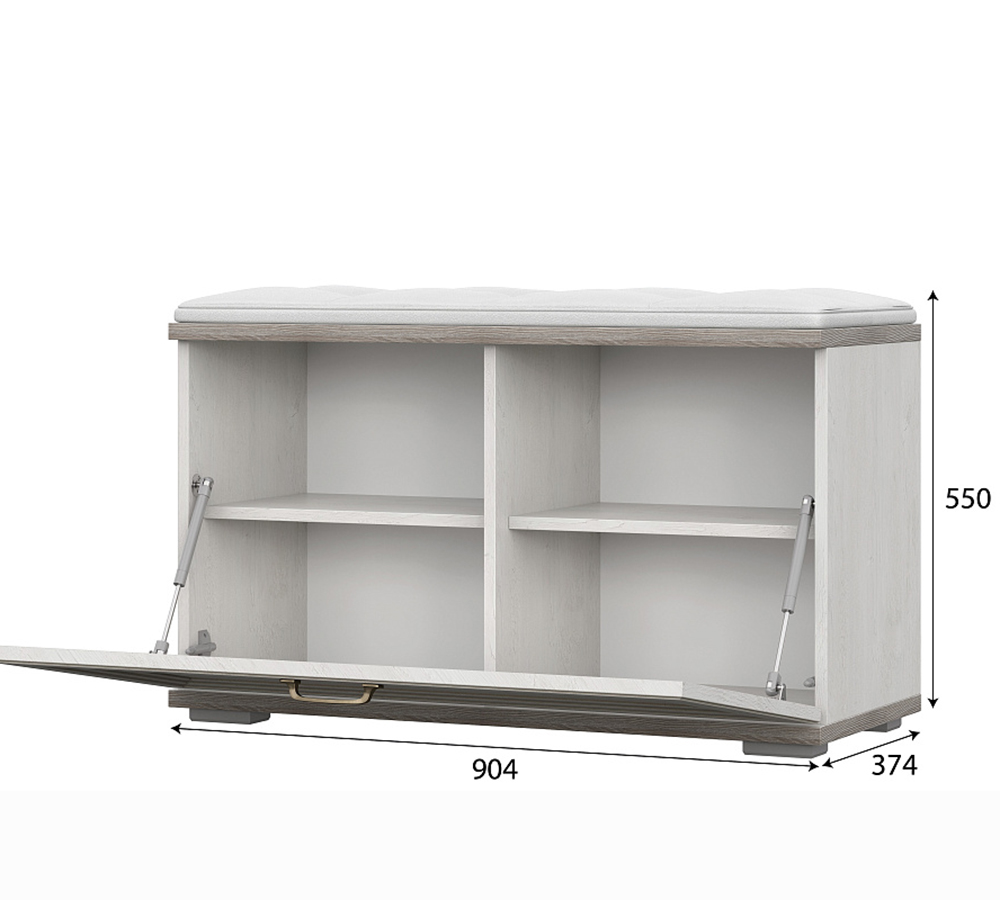 Модули представляют собой тумбы с двумя отделениями для хранения обуви закрытыми единой глухой створкой, открывающейся сверху вниз на газлифтах. Для плавного закрывания створки в комплект фурнитуры включены накладные демпферы. Каждое отделение комплектуется съемной полкой. Максимальная нагрузка на полку - 5 кг.