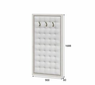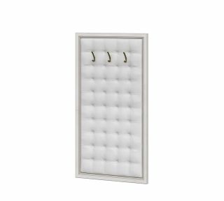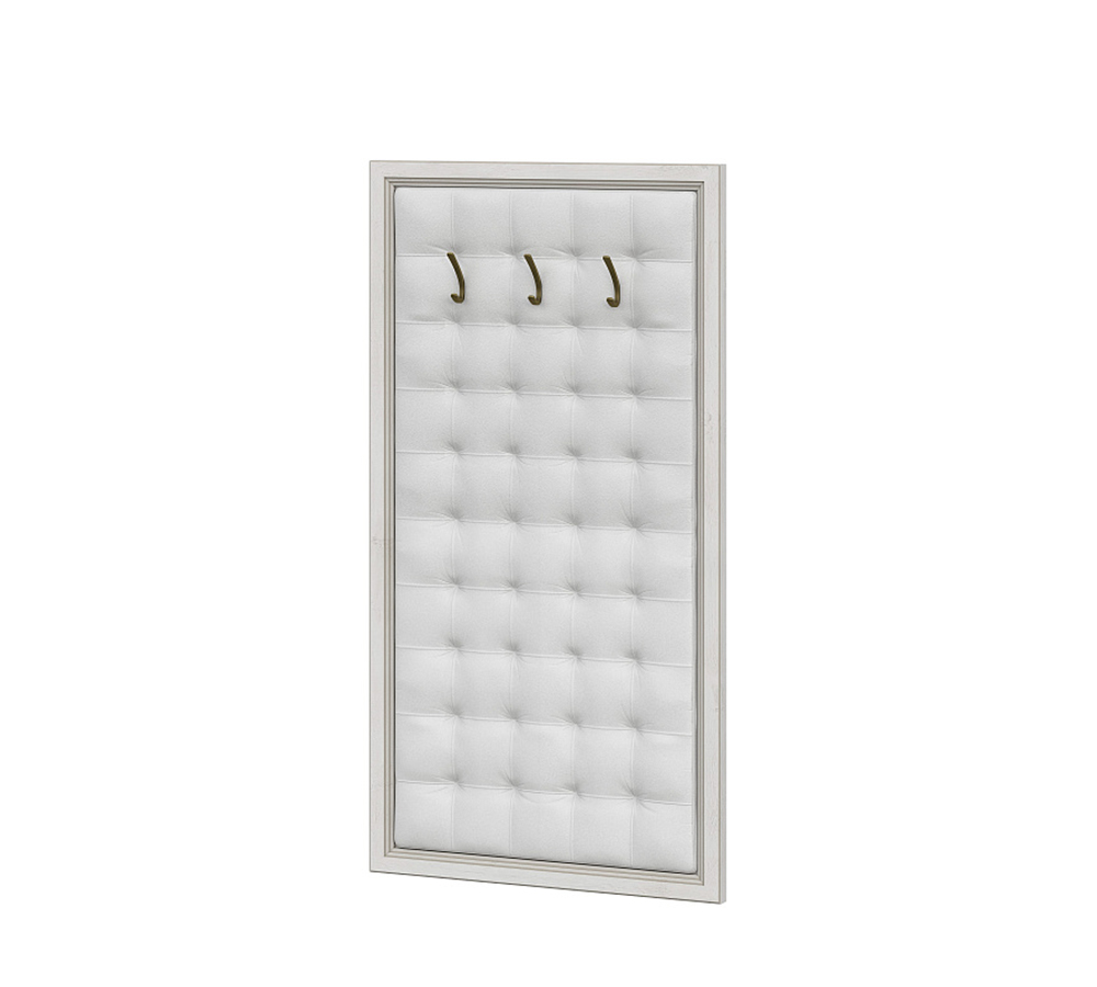 Модуль представляет собой щит из ЛДСП 16мм «Сосна Санторини св.», декорированный резным профилем аналогичной расцветки и мягким щитком, обитым бежевой экокожей с декоративной строчкой «Квадрат». Модули комплектуются крючками для одежды: 3 шт. Вешалка крепится на стену при помощи врезных навесов с крюками.