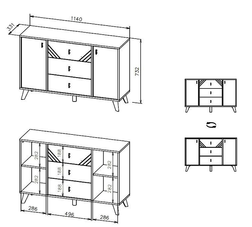 • Комод двухстворчатый с тремя выкатными ящиками на шариковых направляющих. На верхнем фасаде ящика расположена декоративная фрезеровка. В левой и правой частях расположены отсеки с