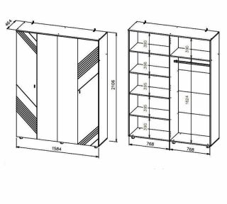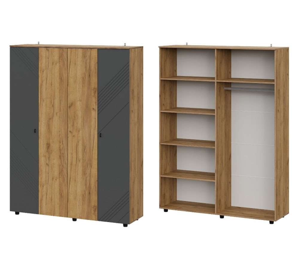 Шкаф распашной четырехстворчатый. Центральные створки из ЛДСП, крайние створки из МДФ с фрезеровкой в пленке ПВХ. В левой части шкафа расположен отсек с четырьмя полками (одна стационарная и три съемных), в правой части шкафа расположен отсек со стационарной полкой и штангой (присадка под штангу отсутствует, покупатель устанавливает ее самостоятельно).