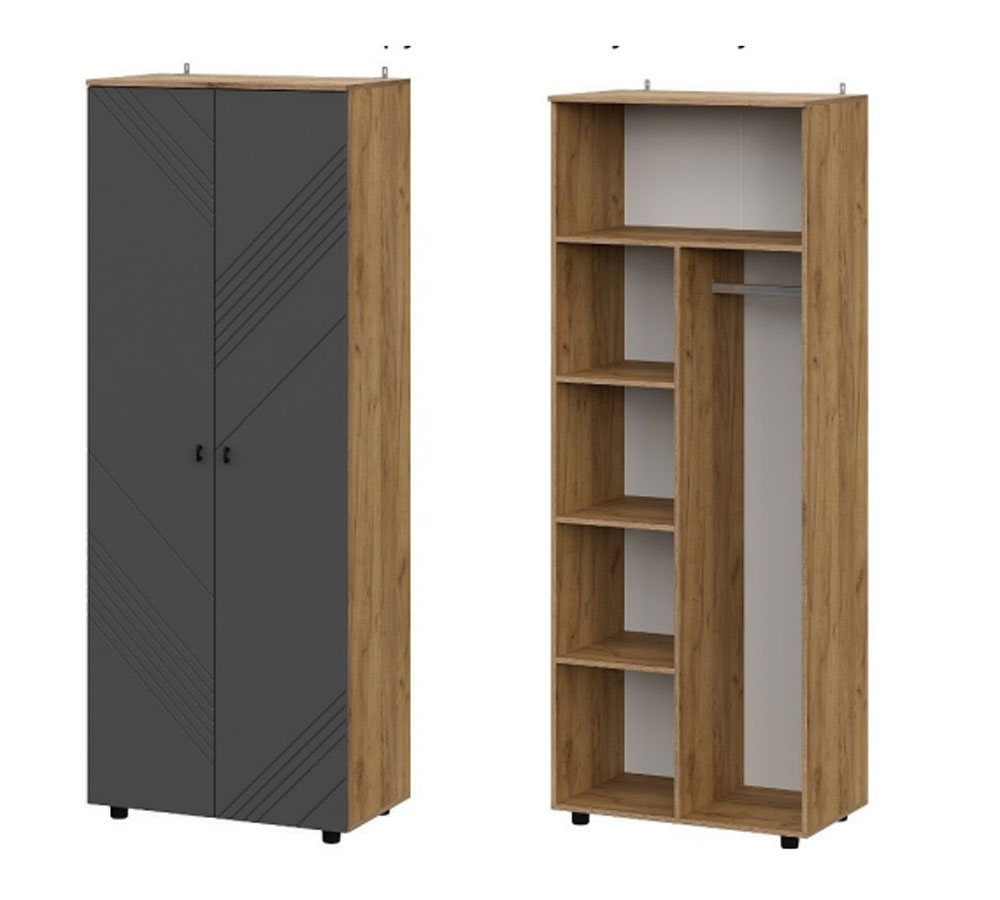 Шкаф распашной двухстворчатый. Створки из МДФ с фрезеровкой. В левой части шкафа расположен отсек с тремя полками, в правой части шкафа расположен отсек со штангой (присадка под штангу отсутствует, покупатель устанавливает ее самостоятельно), над обоими отсеками установлена стационарная полка на всю ширину шкафа.