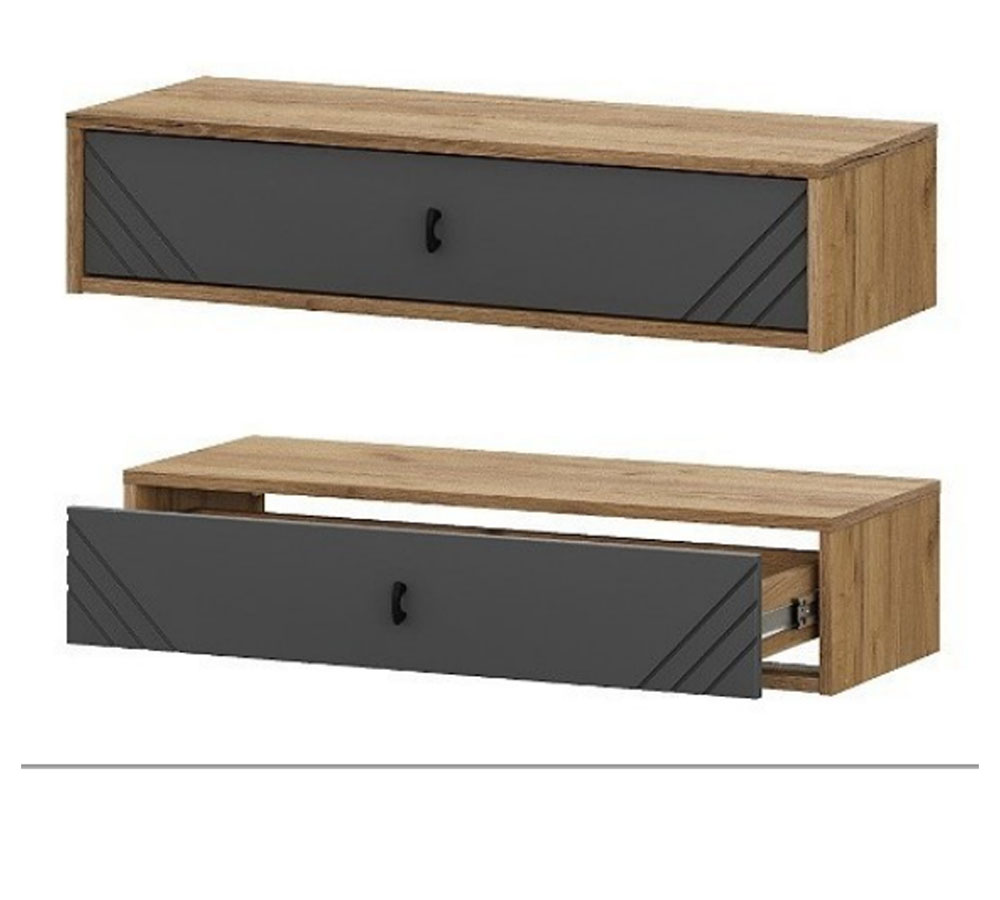 Стол туалетный навесной с выкатным ящиком, ящик с перегородкой, разбивающей пространство на два отсека. На фасаде ящика расположена декоративная фрезеровка. Стол навешивается на стену, напольная установка не предусмотрена