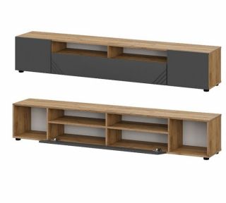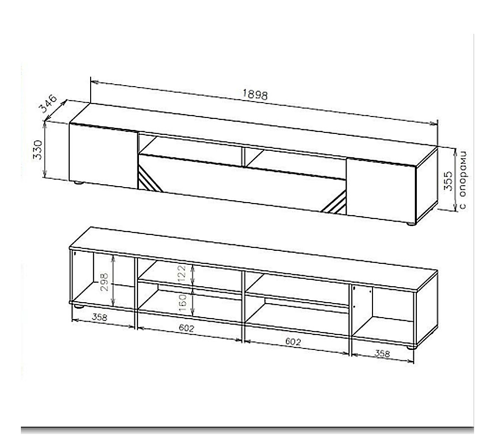 Тумба для установки телевидеоаппаратуры со створками и открытой нишей. На центральной створке расположена декоративная фрезеровка. Внутреннее наполнение тумбы разбито на несколько отсеков для хранения. Слева и справа два отсека за распашными створками, по центру снизу закрытый отсек с перегородкой, над ним открытая ниша с перегородкой.