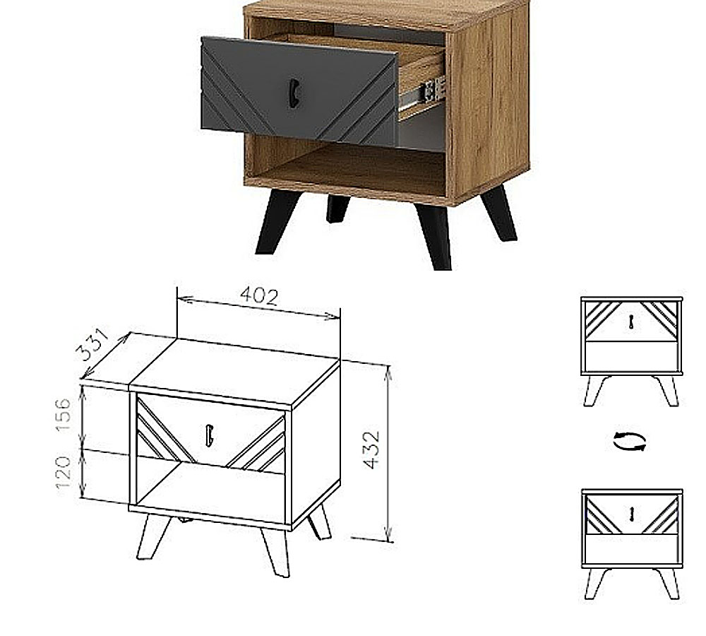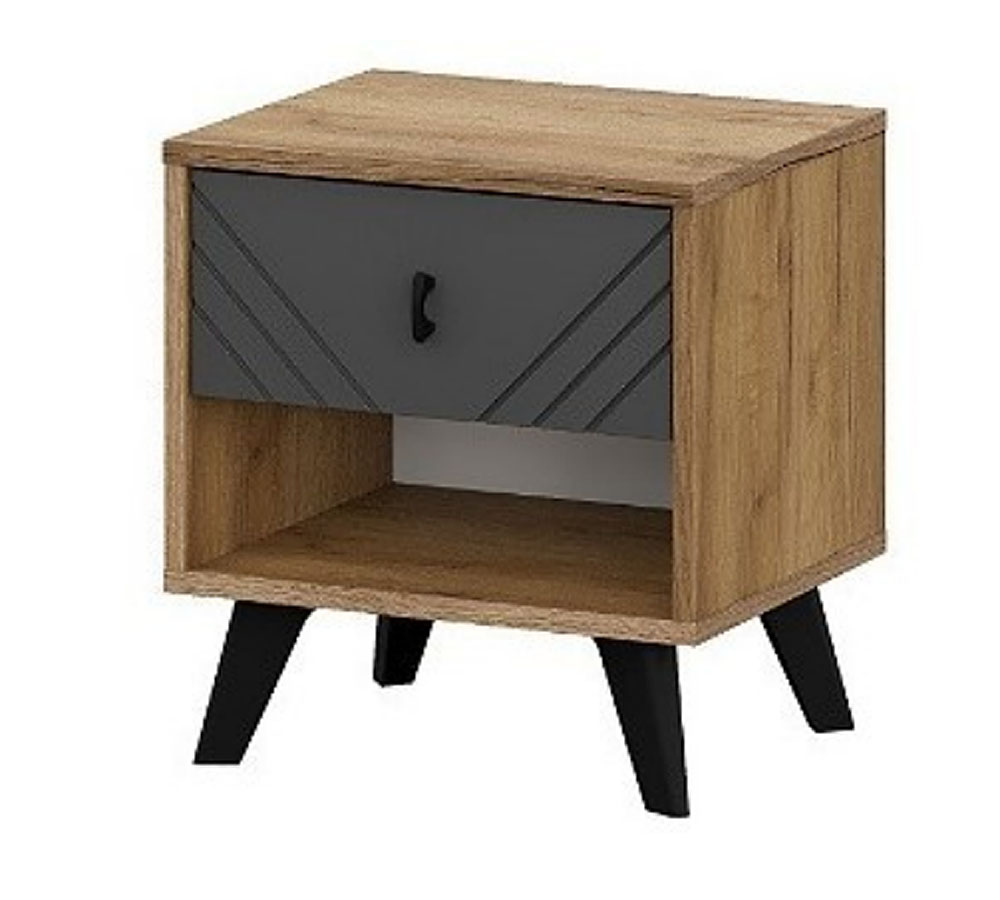 Тумба прикроватная с выкатным ящиком и открытой нишей. На фасаде ящика расположена декоративная фрезеровка. В верхней части расположен выкатной ящик, под ним открытая ниша.