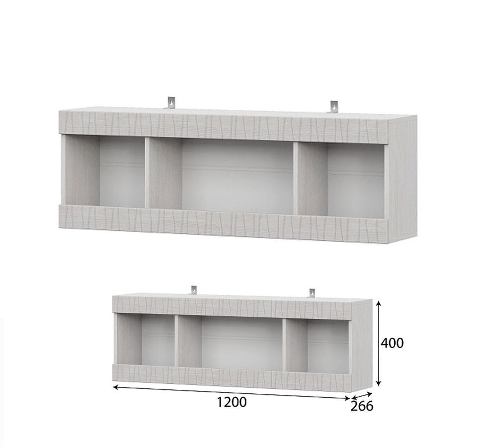 Модуль представляет собой открытую полку разделенную вертикальными перегородками на 3 отсека для хранения. По бокам два отделения шириной соответственно 304мм. В середине отделение шириной 528 мм. Полка навешивается на стену с помощью нерегулируемых угловых навесов или устанавливается между модулями на межсекционные стяжки (в комплекте). Крепеж в стену приобретается покупателем самостоятельно, исходя из материала стен.