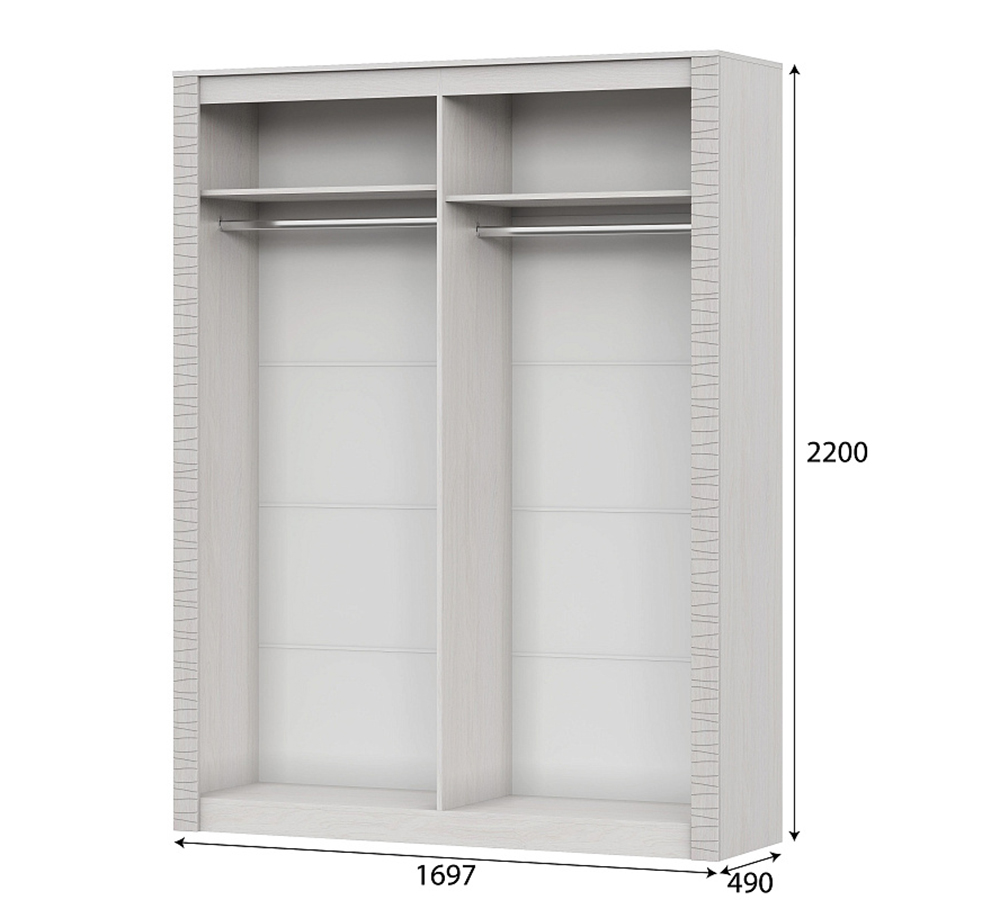 Шкаф комплектуется четырьмя глухими створками и разделен вертикальной перегородкой на два отделения одинаковых размеров. Каждое отделение комплектуется полкой сверху и металлической штангой. Средние створки не комплектуется ручками, на них приклеиваются зеркала 363х2083х4 мм. Зеркала приклеиваются при сборке. Шкаф можно состыковать с угловым шкафом. В качестве доп опции, любое отделение шкафа можно укомплектовать полками. В комплект входят 4 полки и полкодержатели к ним. Отверстия под полкодержатели в боковинах шкафа присутствуют по умолчанию. Для безударного закрывания створок модуль можно укомплектовать накладным демпфером.