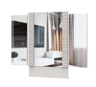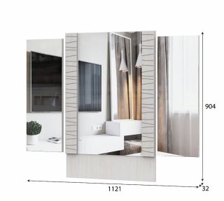 Модуль состоит из трех ЛДСП-панелей, к которым при сборке приклеиваются зеркала. Панели по краям поворачиваются на трельяжных петлях. Зеркало предназначено для установки на модуль «Стол туалетный».