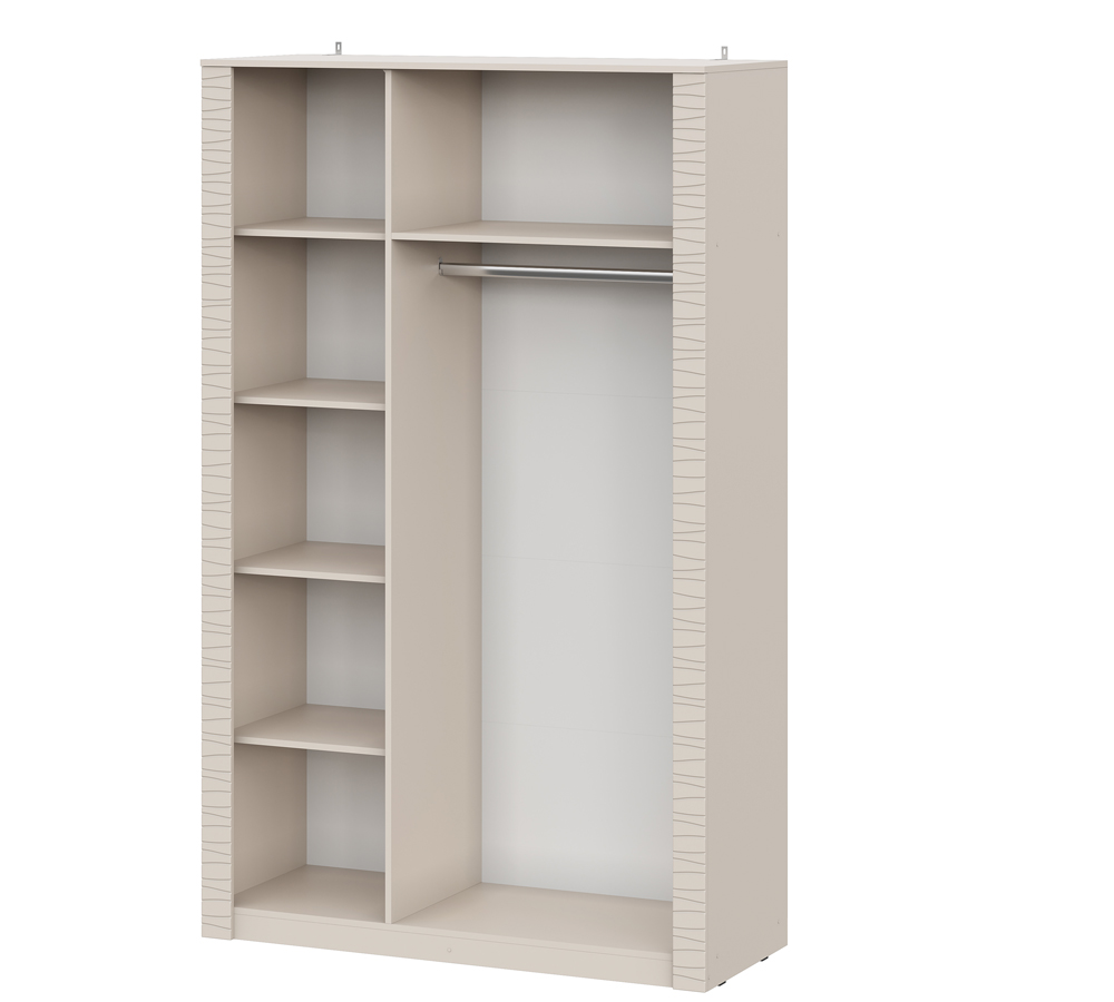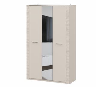 Шкаф трехстворчатый c распашными створками и декоративными элементами из МДФ в ПВХ пленке с фрезеровкой от МС Гамма-20. В левой части расположен отсек для хранения с 4мя полками, в правой части отсек со штангой, над которым расположена стационарная полка. Крайние створки крепятся на декоративные