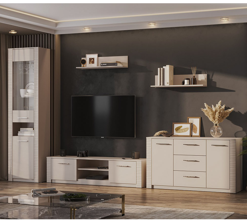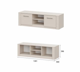 В комплект входит комод 1200, тумба ТВ 1300, пенал со стеклом, полка навесная -2шт.
