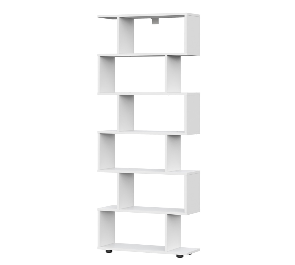 Стеллаж состоит из шести одинаковых секций, смещенных от центра в шахматном порядке.