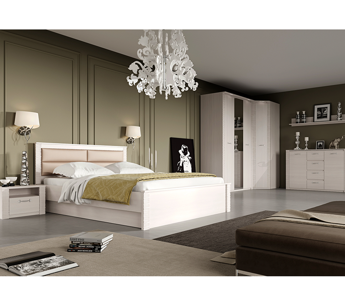 Спальный гарнитур с нежным названием «Элана» такой же мягкий и романтичный. В нем воплощены самые актуальные тенденции мебельной индустрии, основой которых сегодня является акцент на мягкие, природные, естественные линии.
