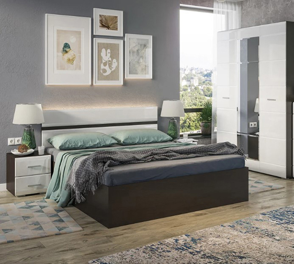 Модульная спальня Вегас — это сочетание отличного качества, стильного дизайна. В комплект входят модули: Кровать на 1400, шкаф 3-дверный, комод, тумба 2 шт.