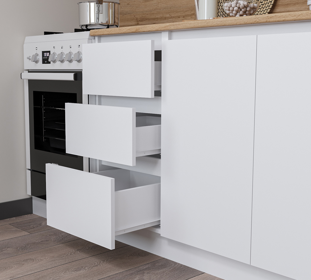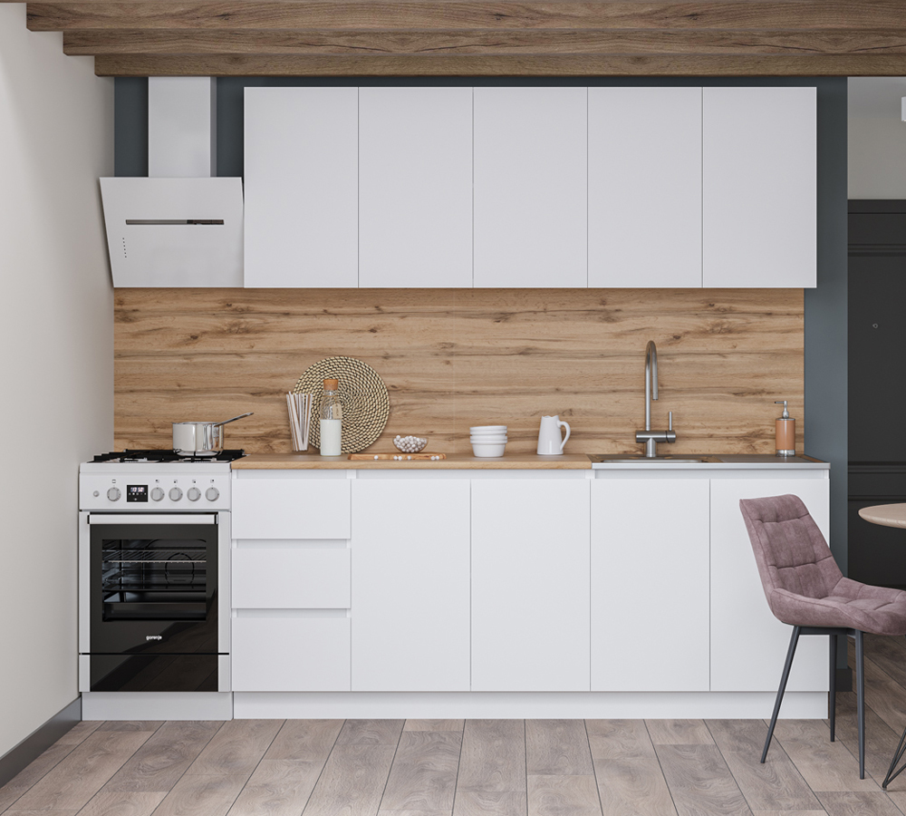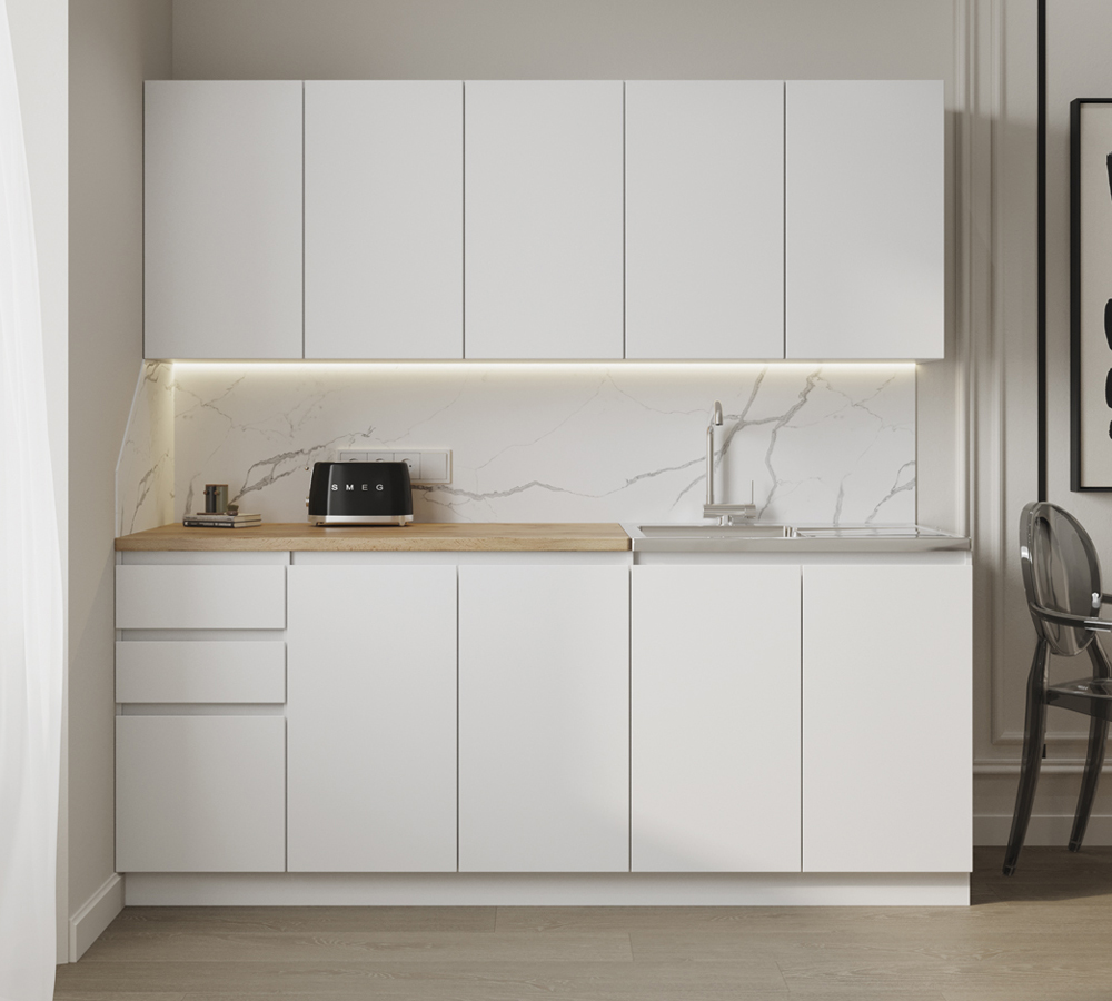 Кухонный гарнитур «Мори» это стандартное решение размером 2000 мм., которое выполнено в едином белом оттенке из ЛДСП. Отличительная особенность данной кухни - её интегрированные ручки.