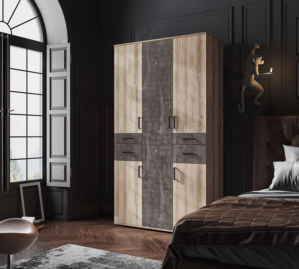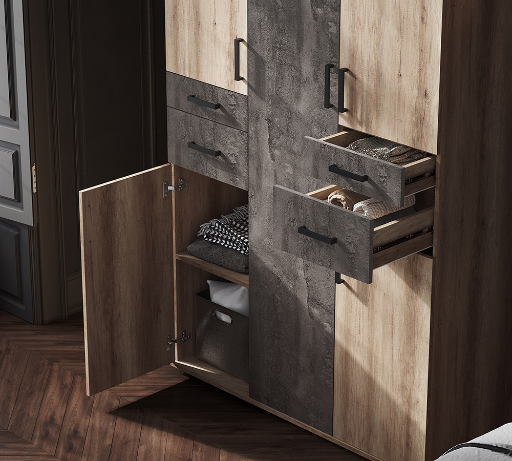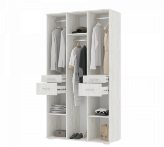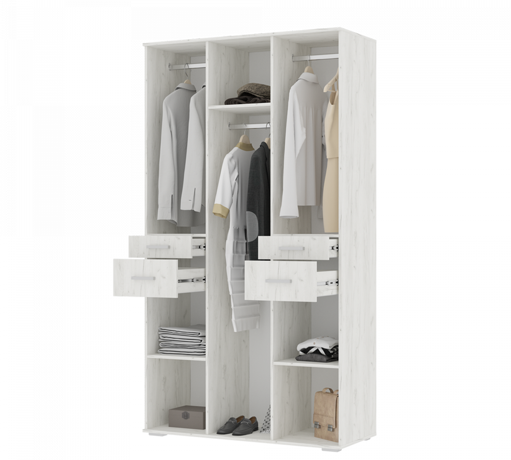 Уникальный конструктив и нестандартный подход к организации вещей. За боковыми верхними распашными створками расположены штанги для хранения одежды малой длины. За боковыми нижними распашными створками - полочное пространство. На среднем уровне в боковых секциях расположены небольшие выкатные ящики на шариковых полновыкатных направляющих. Центральная секция отведена под хранение одежды большой длины.