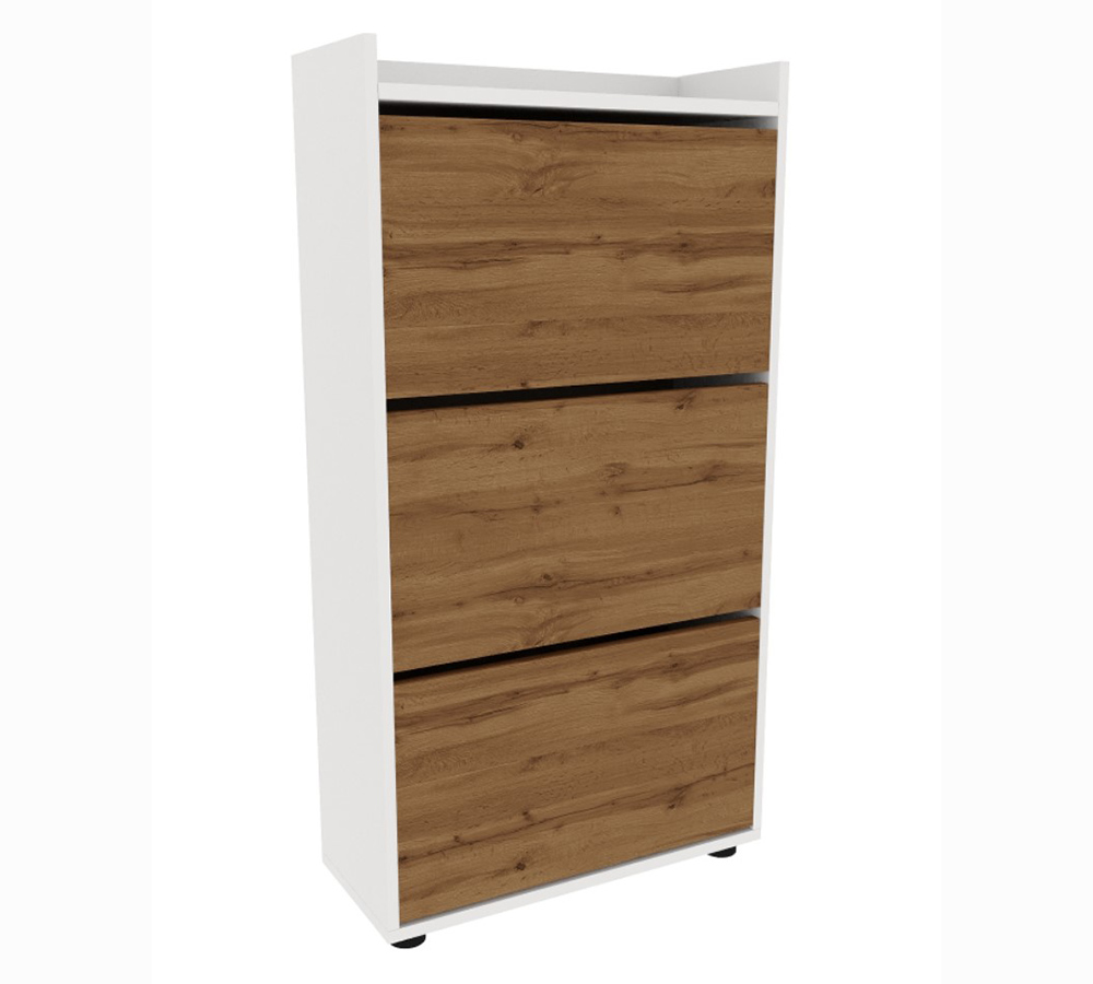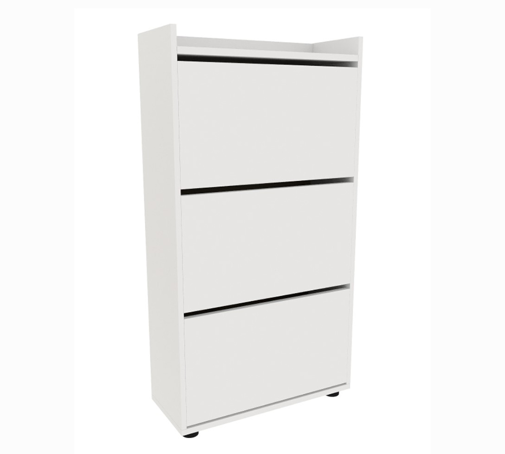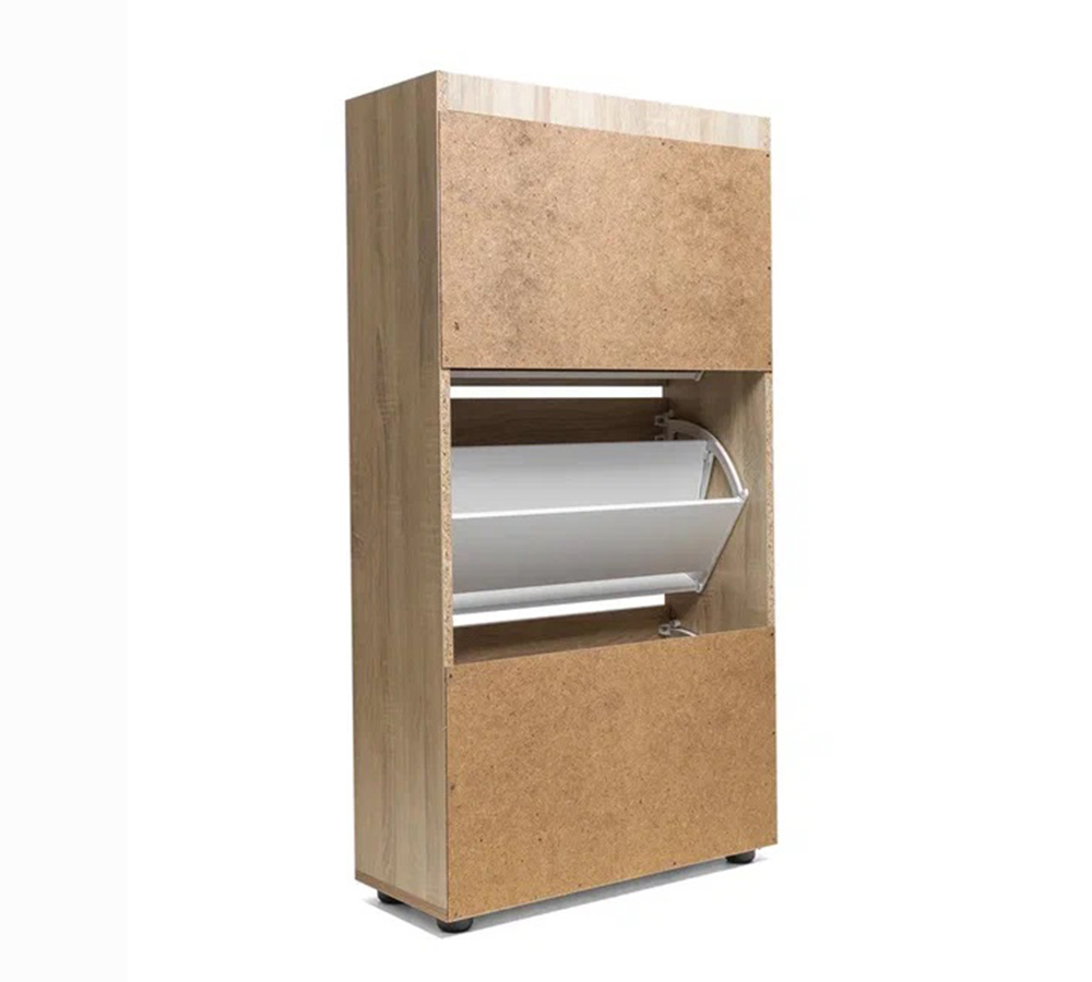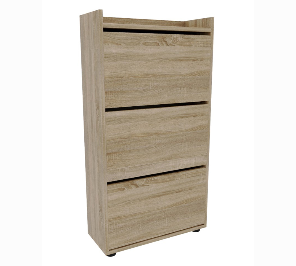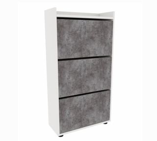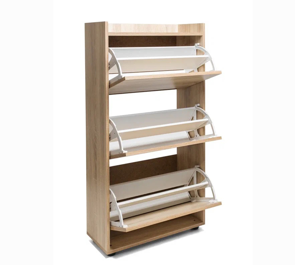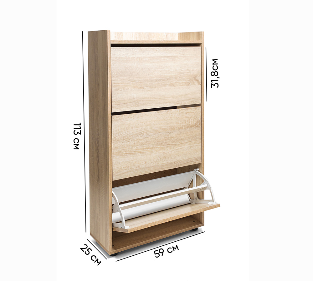 Компактная, не глубокая обувница с тремя отделениями, рассчитана на 12-15 пар невысокой обуви на плоской подошве или небольшом каблуке.