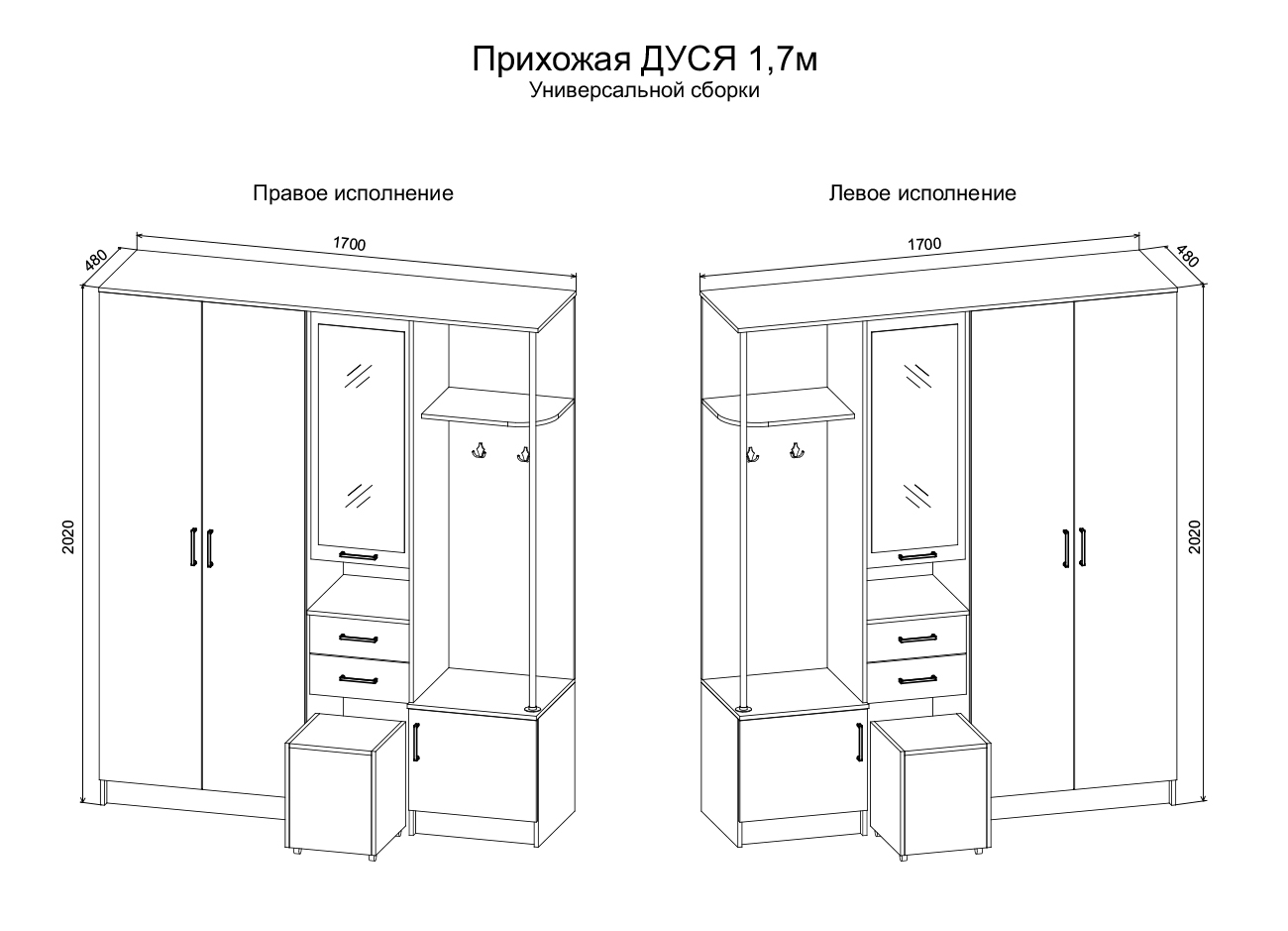 Дополнительно: Прихожая «Дуся» доступна в двух вариациях размеров: 1.3 и 1.7 м.