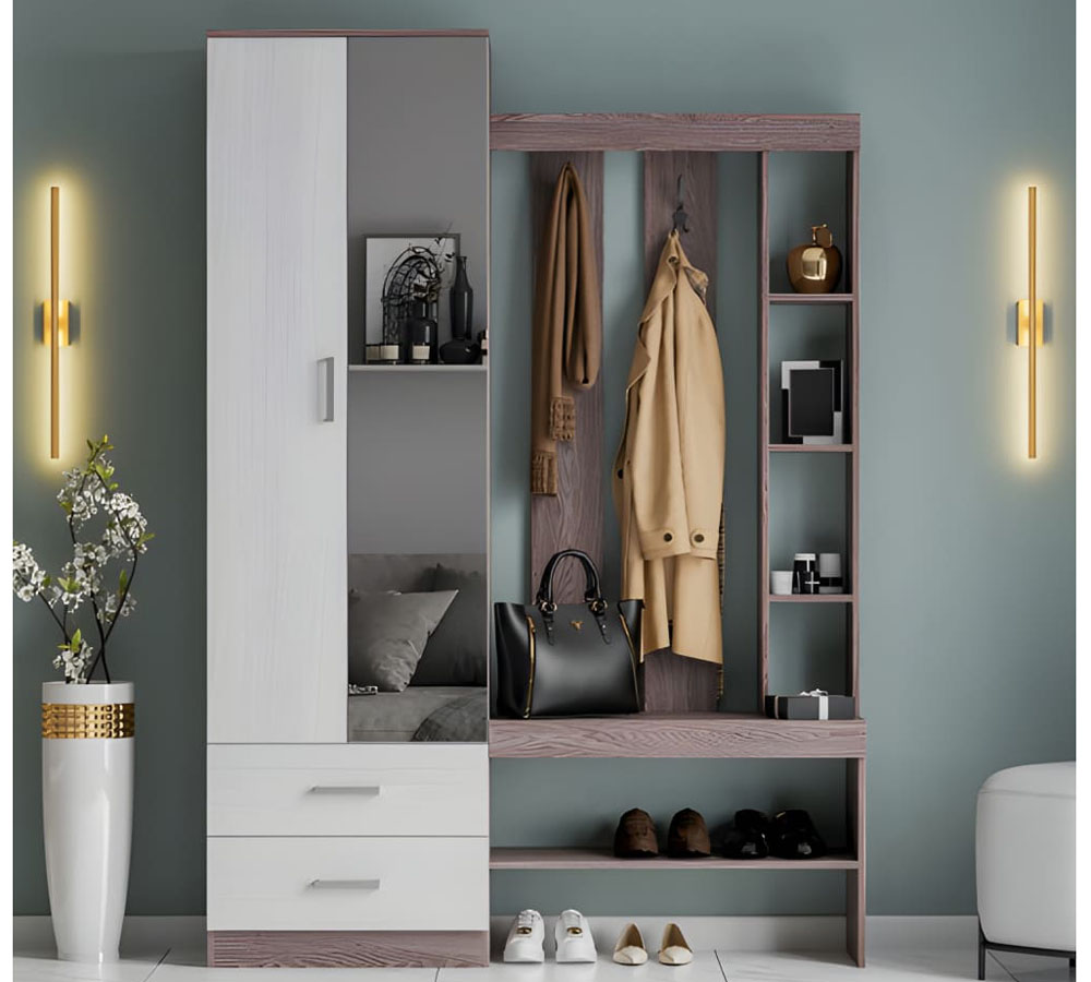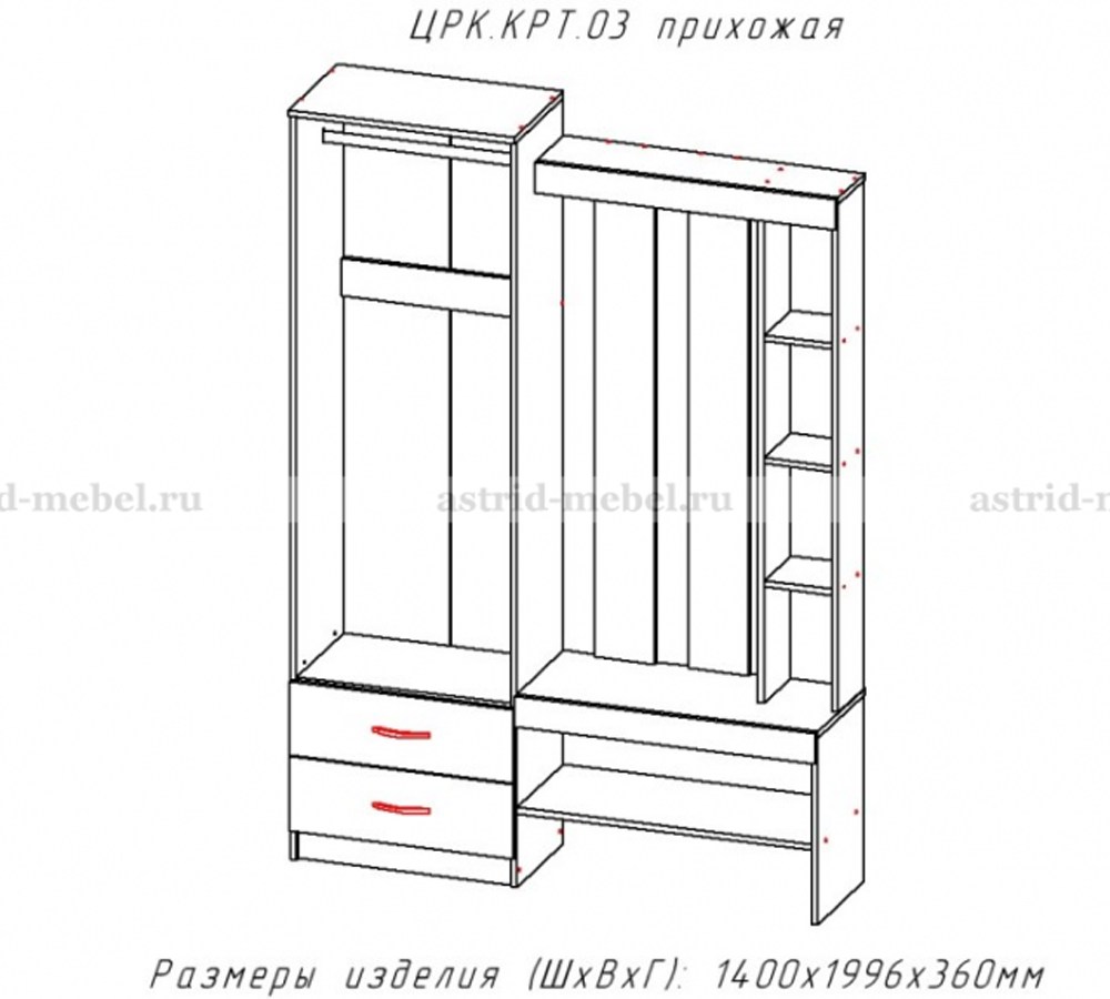 Функциональный модуль для прихожей "Крит-3" (КРТ.03) содержит все необходимые элементы для размещения одежды и аксессуаров. В модуль входит двухстворчатый шкаф с двумя выдвижными ящиками и широкой секцией, комплектующейся штангой для вешалок. Один из фасадов шкафа декорирован высоким зеркалом. Широкая боковая часть модуля содержит открытые полки для обуви и аксессуаров, крючки для одежды.