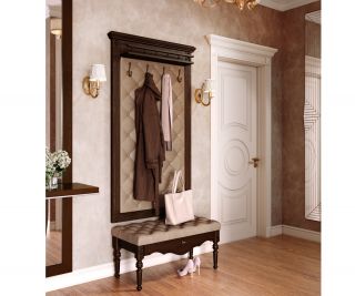 Прихожая выполнена из массива Береза в цвете Орех, банкетка и вешалка обтянуты эко кожа - каретная стяжка. Для любителей классики в стиле барокко.