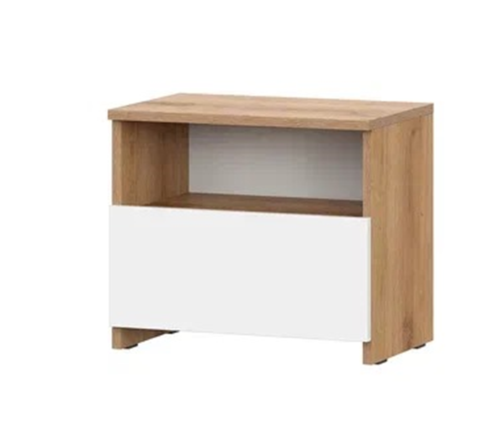 Тумба прикроватная с одим выдвижным ящиком на шариковых направлящих, над ящиком открытая ниша. Фасад накладной. Сборка корпуса не универсальная.