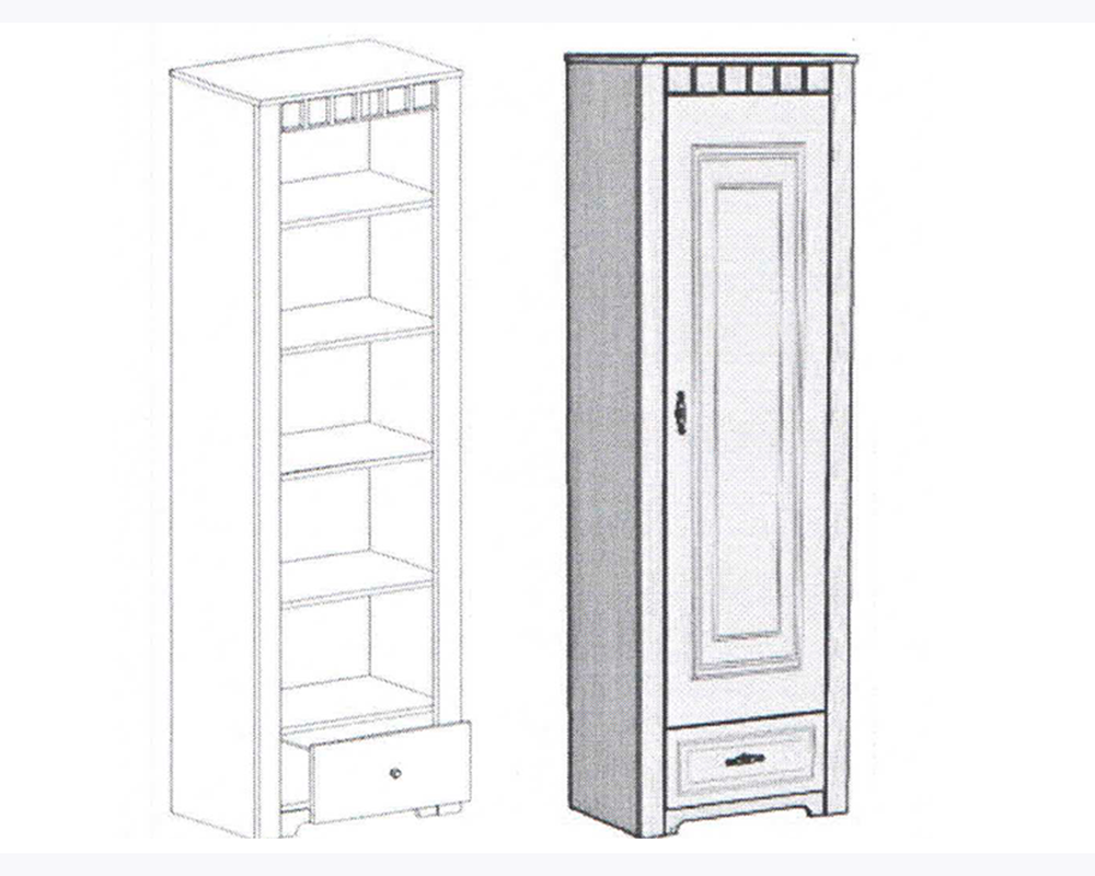 В шкафу расположены распашная дверь и в нижней части ящик на шариковых направляющих глубиной 350 мм. Дверь монтируется как на правую, так и на левую стороны. За распашной дверью располагаются четыре съёмные полки.