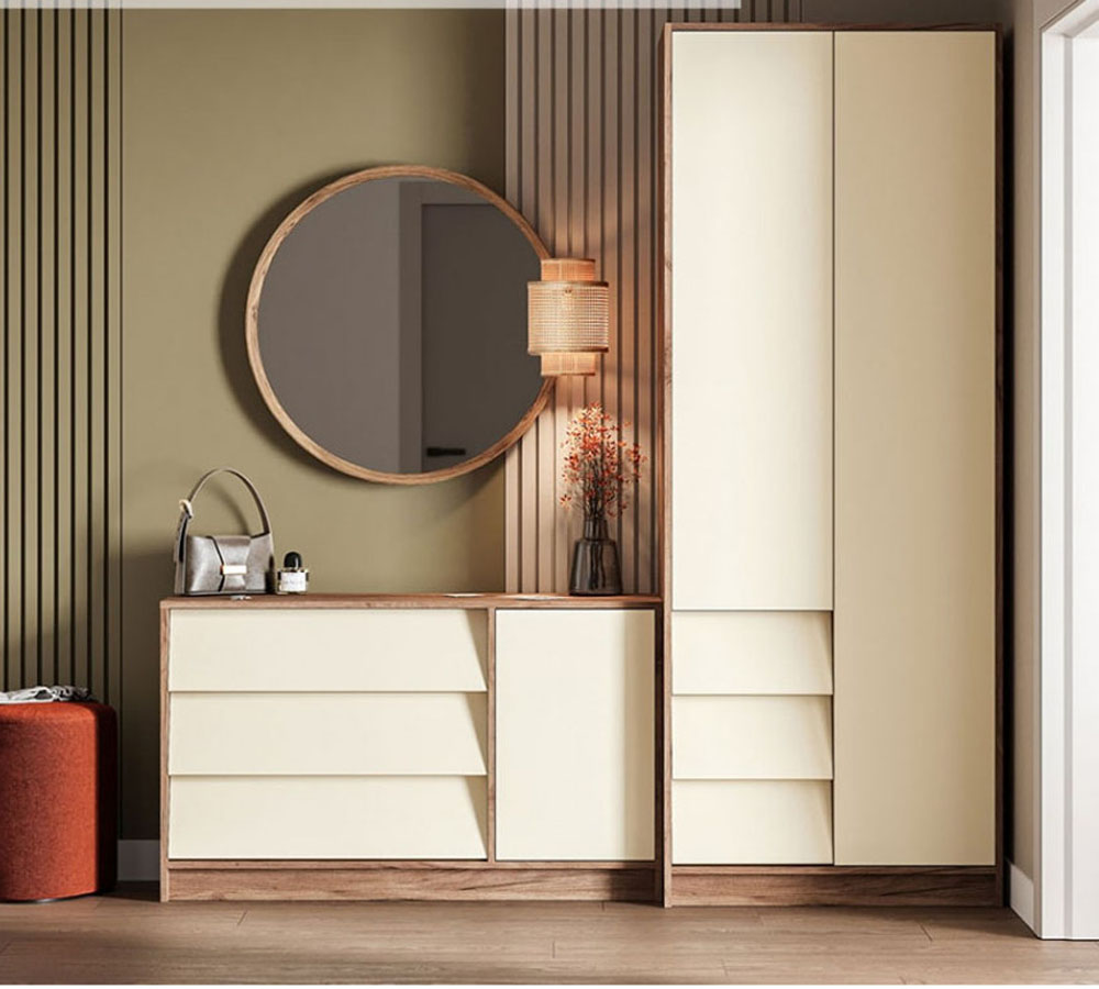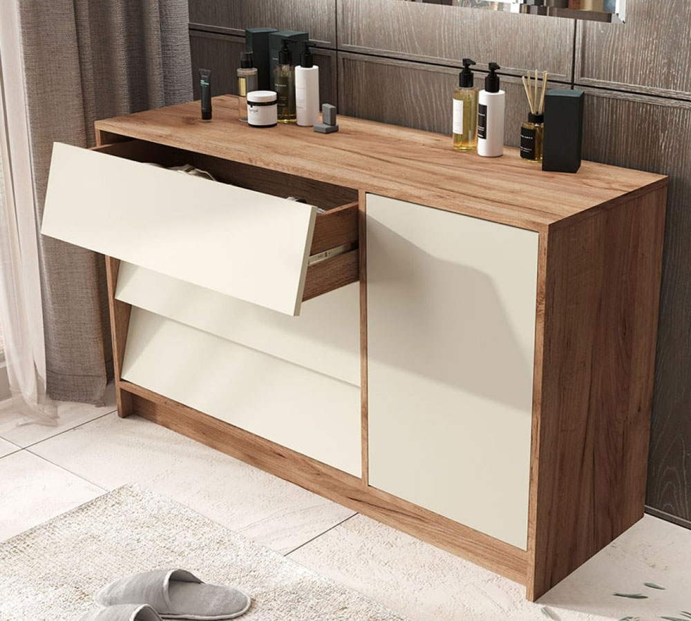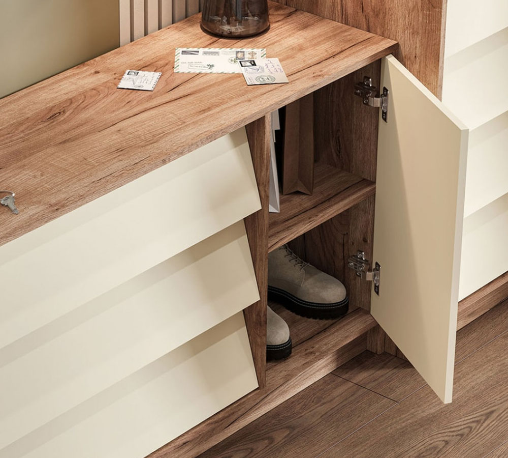 Фасады коллекции привлекают внимание необычной геометрией: плавно наклоненные линии ящиков гармонично сочетаются с ровными гладкими поверхностями створок. Благодаря такому решению мебель выглядит стильно и динамично, сохраняя при этом функциональность и удобство в использовании.