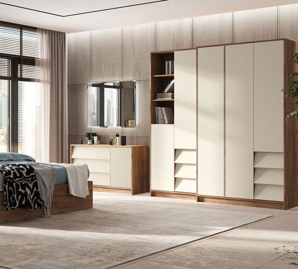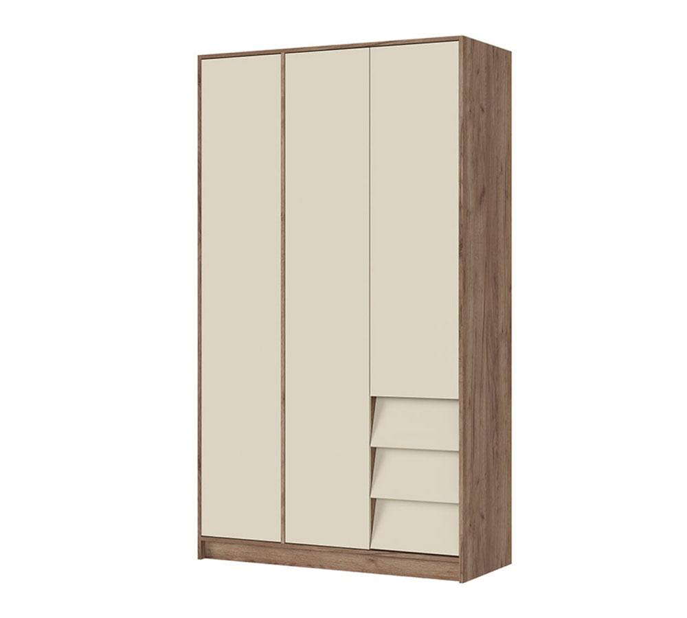 Фасады коллекции привлекают внимание необычной геометрией: плавно наклоненные линии ящиков гармонично сочетаются с ровными гладкими поверхностями створок. Благодаря такому решению мебель выглядит стильно и динамично, сохраняя при этом функциональность и удобство в использовании.