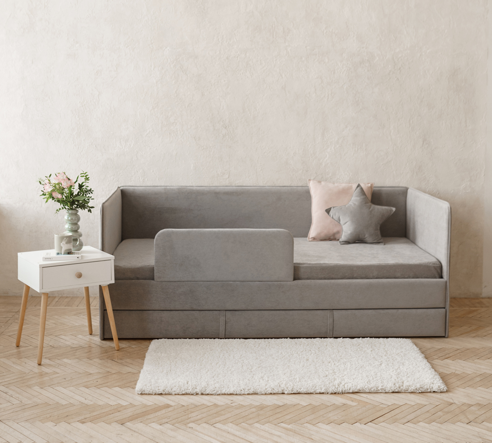 Детский диван-кровать 90*200 см SMILE темно-серый с ящиком и защитным бортиком, кровать детская от 3х лет