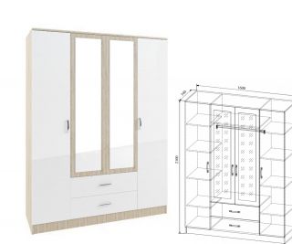 Шкаф четырехстворчатый с двумя выдвижными ящиками и зеркалом. Ширина 1600мм. Элемент модульной системы Софи.