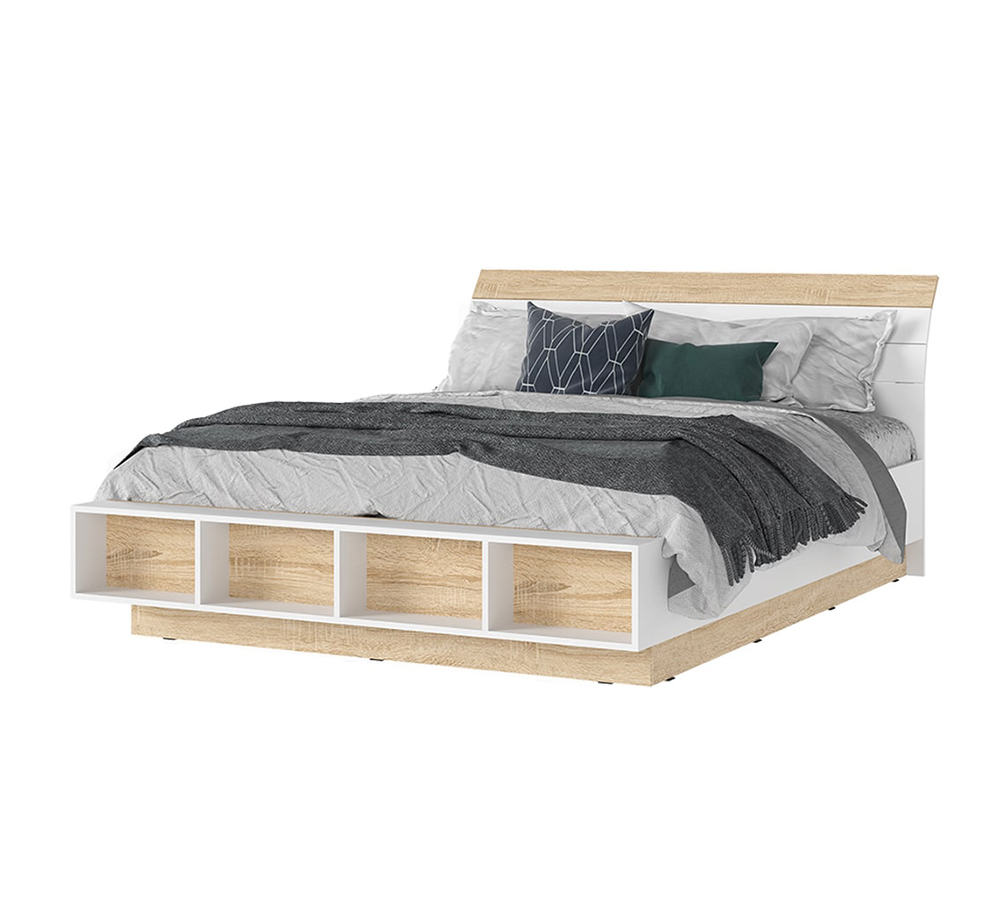 Кровать из коллекции Санса - это удачное сочетание современного дизайна, практичности и комфорта. Модель оснащена ортопедическим основанием с гнутыми ламелями, которое обеспечивает надёжную поддержку матраса и способствует качественному отдыху. Удобное изголовье с декоративной вставкой под дерево и вместительные открытые ниши в основании подходят для хранения книг, текстиля или других вещей. Контраст белого цвета и текстуры светлого дуба придаёт кровати лёгкость и делает её универсальным решением для любого интерьера спальни.