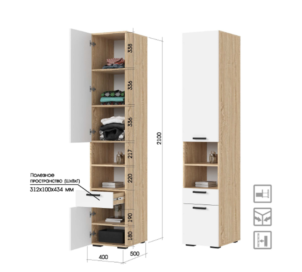Пенал из коллекции Санса - компактный, но при этом функциональный элемент, подходящий для любого помещения: от спальни и детской до прихожей или кабинета. Модель сочетает закрытые и открытые секции: за фасадами скрываются полки для одежды или бытовых предметов, в центральной части предусмотрены ниши для декора или книг, а выдвижной ящик идеально подойдёт для мелочей. Современный дизайн в светлых тонах с древесной текстурой.