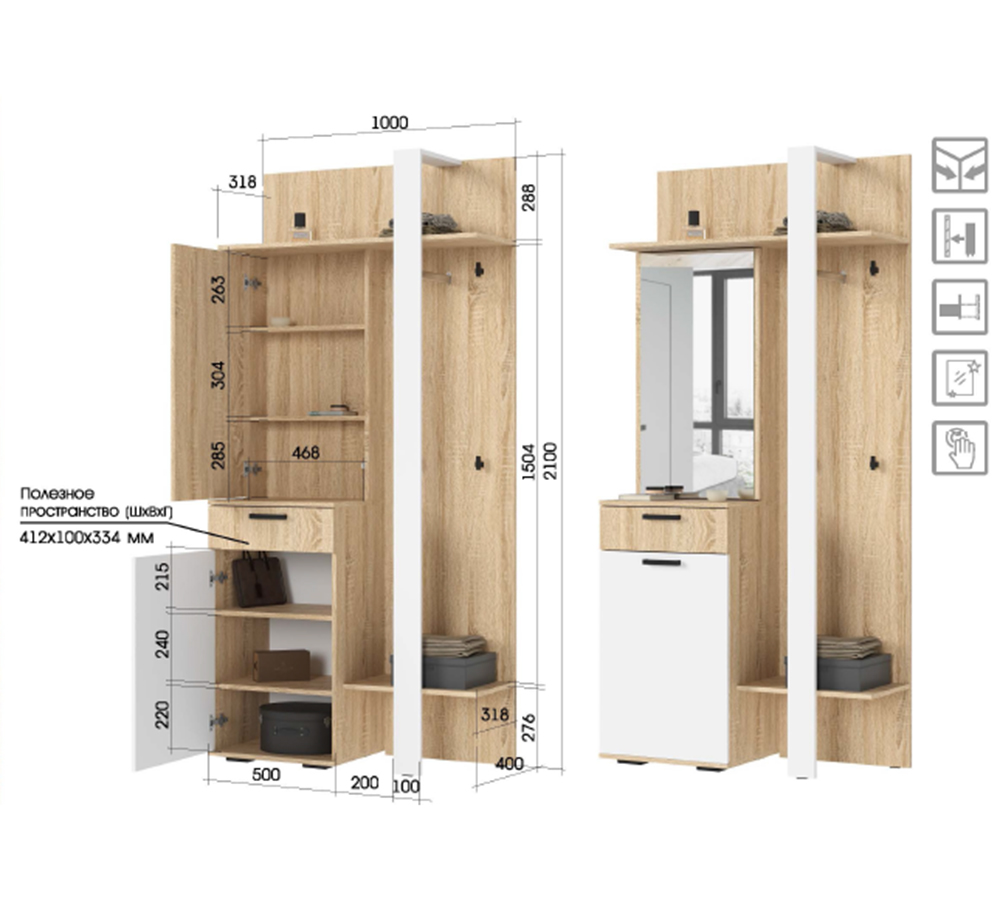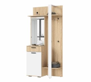 Модуль для прихожей с зеркалом из комекции Санса - это стильное и практичное решение для организации входной зоны. Компактная конструкция включает вместительное отделение для обуви, выдвижной ящик для мелочей, открытые полки, а за зеркалом скрыто дополнительное пространство