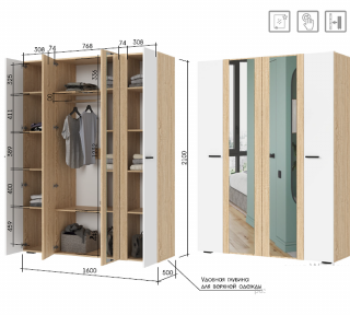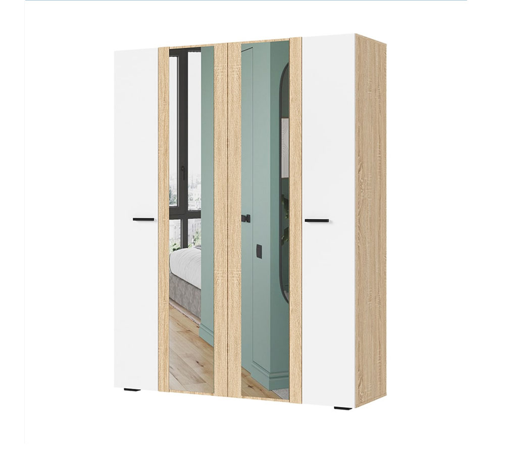Четырехстворчатый шкаф с зеркалом из коллекции Санса - универсальное и вместительное решение для хранения, подходящее как для спальни и гардеробной, так и для прихожей и гостиной.