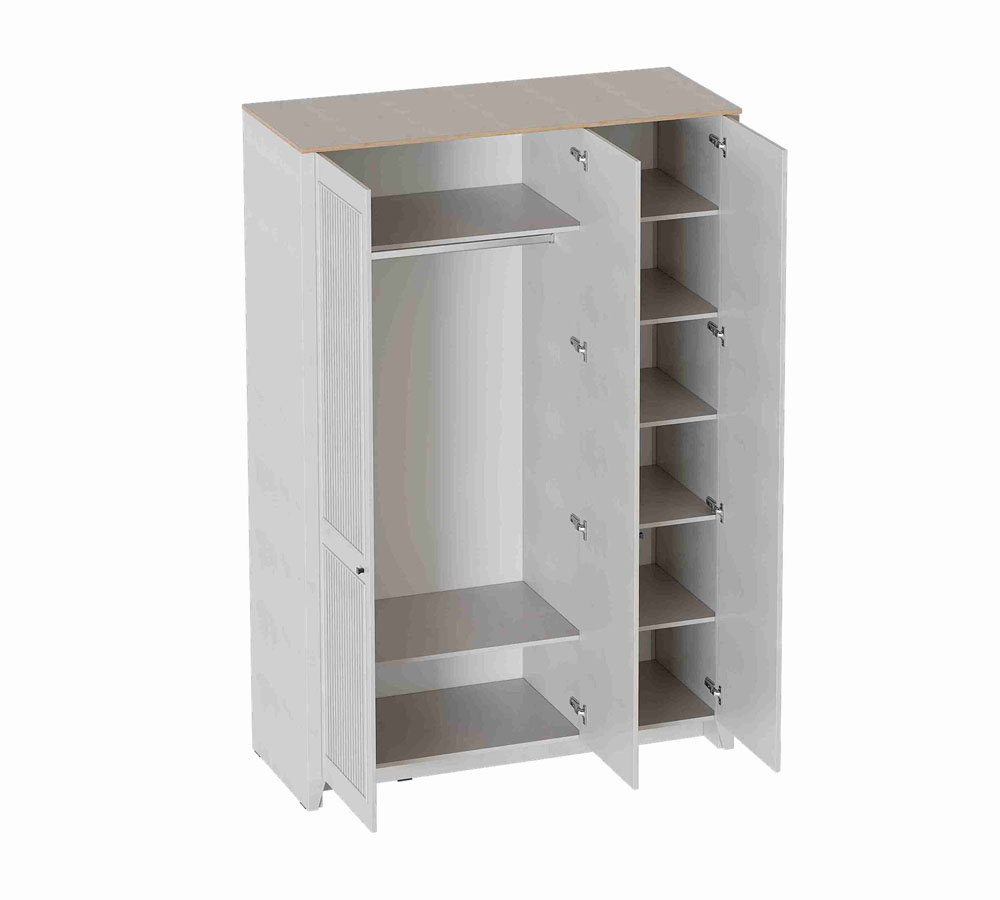 УФ-фотопечать полосок на фасадах в обрамлении пластиковых молдингов придает изделию оригинальный стиль современной классики. В центральной части шкафа расположена штанга для одежды, а также верхняя и нижняя полки, каждая из которых разделена на два отделения. Правая и левая части шкафа имеют по пять полок высотой 332 мм каждая. Задняя стенка шкафа изготовлена из ХДФ. На опорах размещены войлочные подпятники. Высота опор 104 мм. Зеркало выполнено с фацетом.