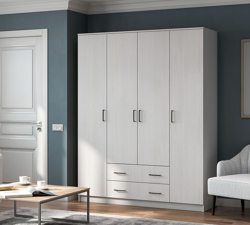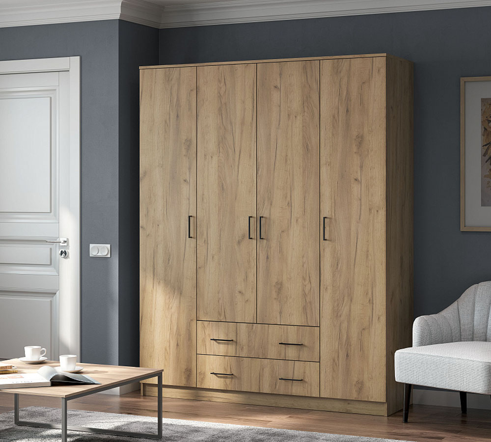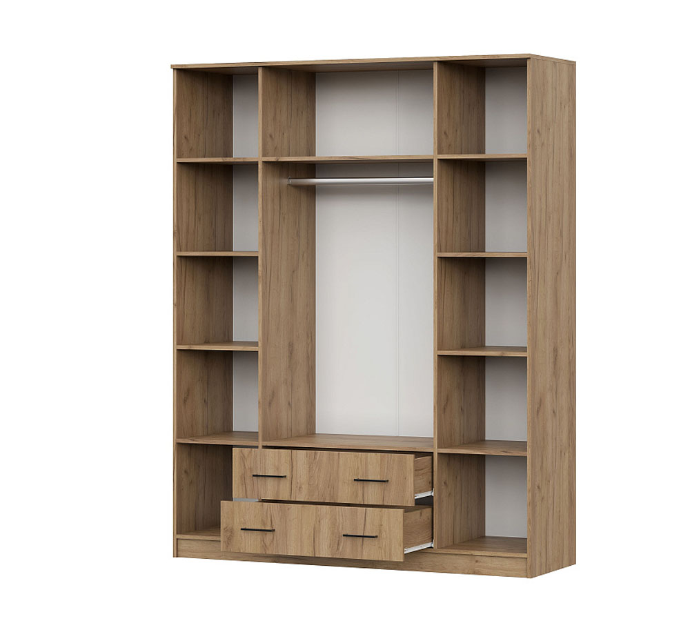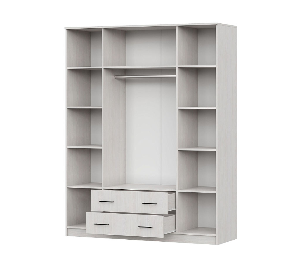 Посередине отделение шириной 768 мм. В нижней части отделения расположена секция с двумя выдвижными ящиками, в верхней — платяное отделение высотой 1512 мм с одной полкой сверху и металлической штангой.
