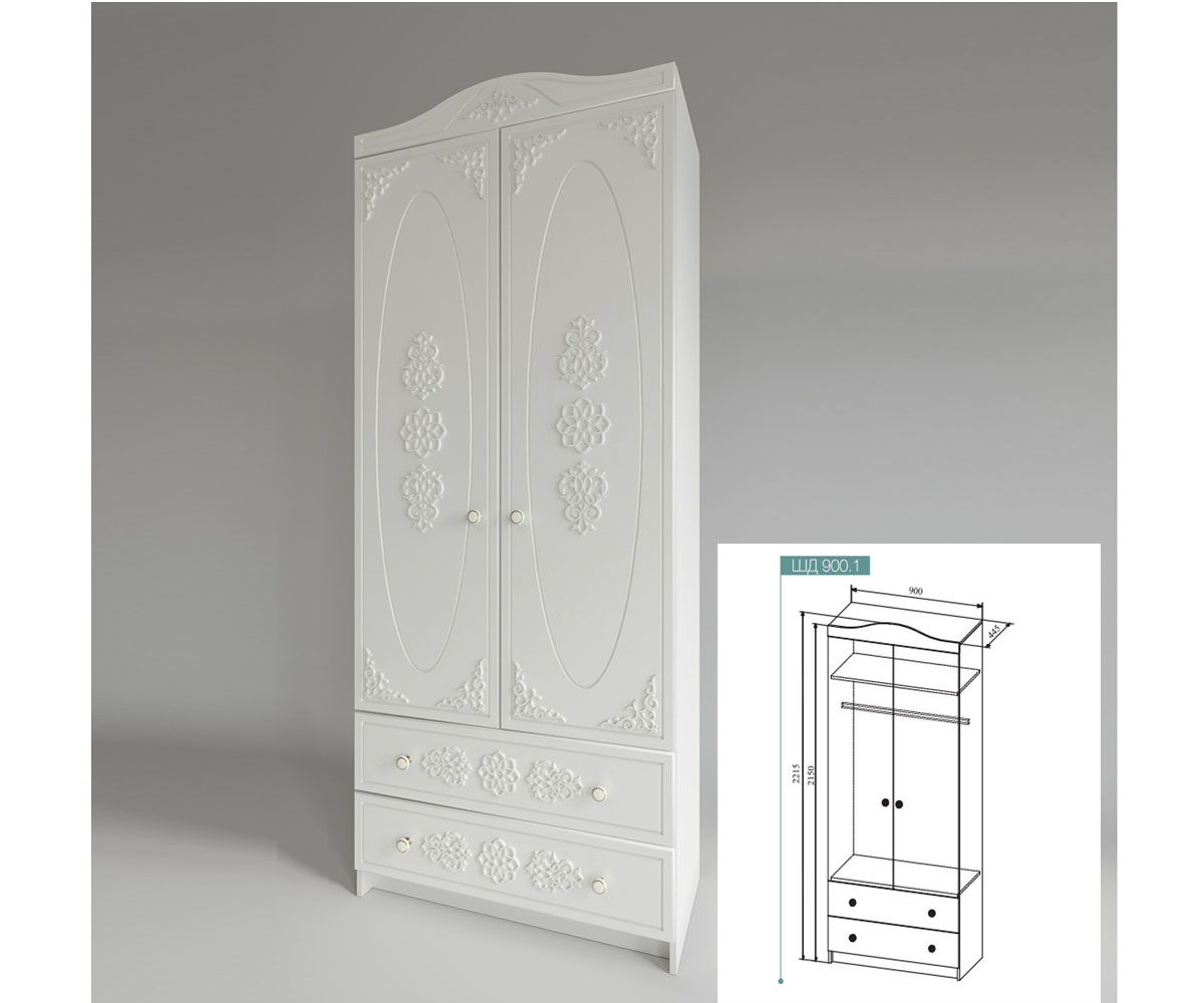 Шкаф распашной двустворчатый с двумя выдвижными ящиками. Белый цвет на фасадах 3Д фрезеровка.