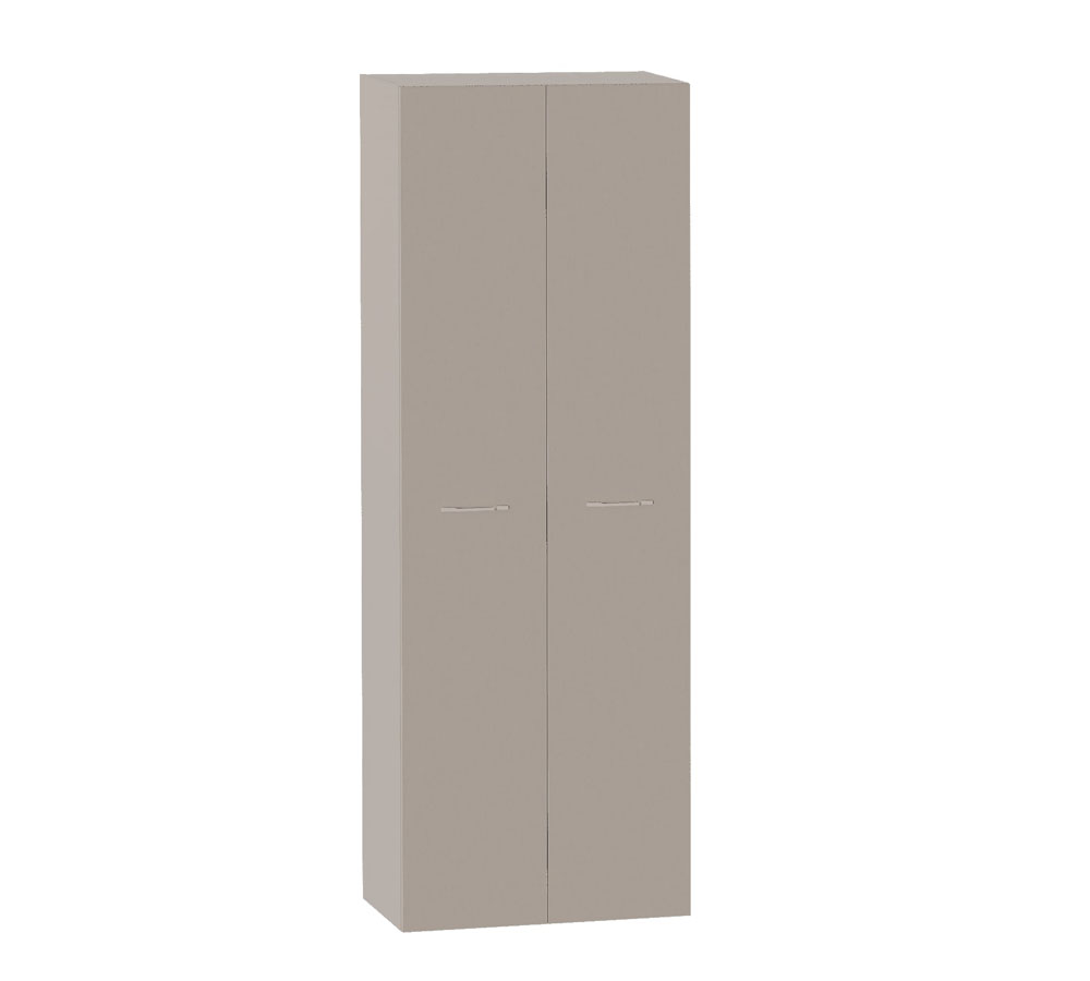 Шкаф двухдверный выполнен из ЛДСП цвета Капучино и имеет 2 вместительных полки в верхней части шкафа, 4 полки в правой части, и штангу для одежды на плечиках - в левой. Ручки в форме скобы выполнены из белого матового металла. Все петли - плавного закрывания.