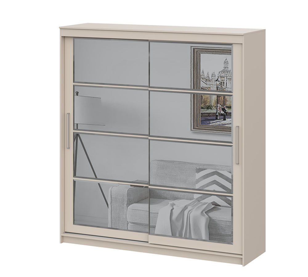 Изделие представляет собой Шкаф с двумя створками купе, левое отделение оснащено полками и двумя выкатными ящиками, правое отделение оснащено штангой для хранение одежды на вешалках.