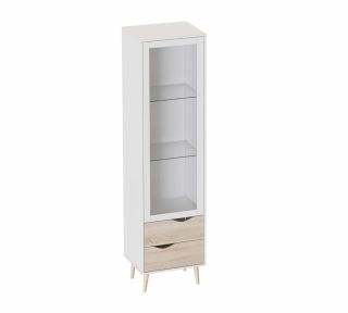 Распашная дверца со стеклом и белоснежным фасадом из ЛДСП защитит коллекционный фарфор, декоративную посуду или книги от пыли, обеспечивая при этом прекрасный обзор всего содержимого полок. В нижней секции, оборудованной двумя выдвижными ящиками с фасадами, декорированными прорезными ручками, можно хранить предметы, имеющие более утилитарное назначение.