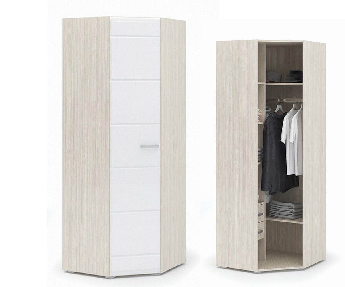Шкаф угловой 1 створчатый в цвете дую/белый глянец. Наполнение: Внутренние 2 ящика, полки, штанга. Габарит:850 x 2000 x 850мм.