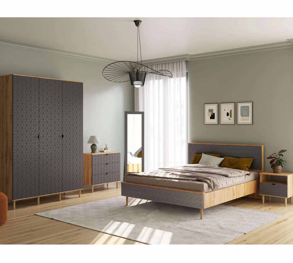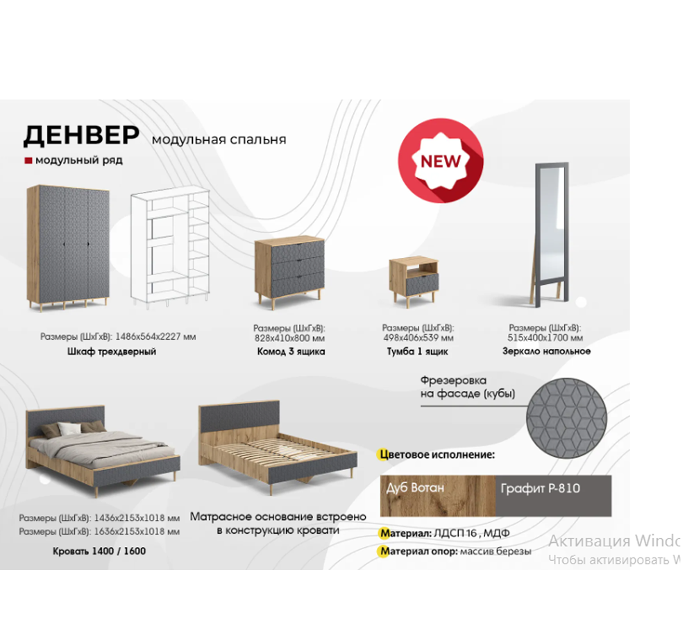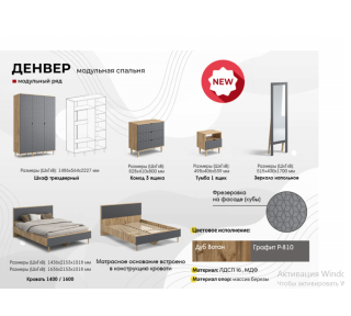 Спальный гарнитур “Денвер” выполнен в шикарном цветовом сочетании “Дуб вотан/Графит”, который привнесет в Ваш дом ощущение стиля, тепла и спокойствия.