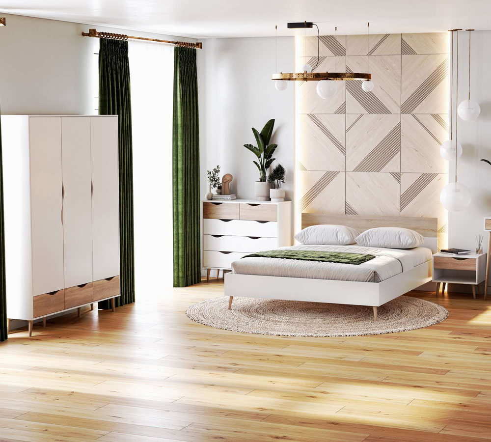 Серия «Соната» отличается простотой и натуральностью, выполнена в естественных тонах. В дизайне отчетливо улавливаются отсылки к скандинавской эстетике: чистые линии корпуса, использование белого цвета в отделке фасадов, расставленные в стороны высокие стильные опоры, выполненные из массива березы.