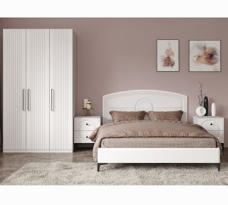 Фасады выполнены из МДФ с матовой ПВХ-плёнкой. Такое решение делает мебель визуально более "мягкой", комфортной и расслабляющей, что особенно актуально для спальни.