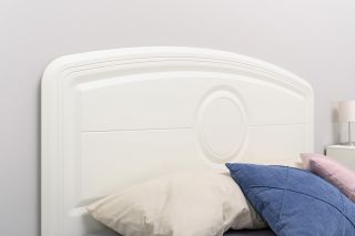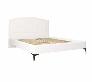 Кровать установлена на высокие ножки, что делает конструкцию лёгкой и воздушной, изголовье кровати декорировано пышным мягким элементом. Матрас укладывается на ортопедическое основание с гнутоклееными ламелями.