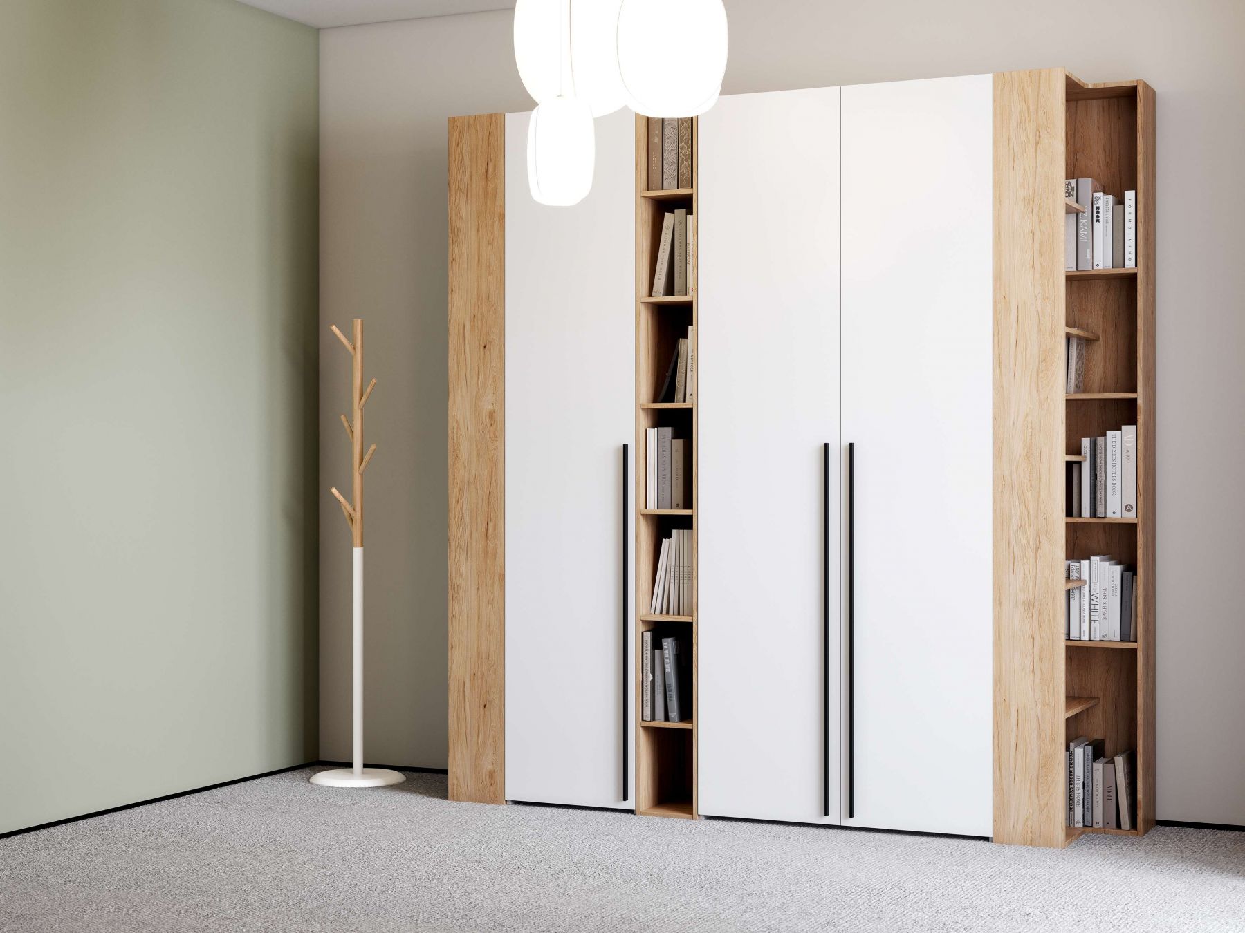 При заказе нескольких модулей шкафной группы, в том числе и стеллажей в комплекте присутствует фурнитура для стягивания модулей между собой (межсекционные стяжки).