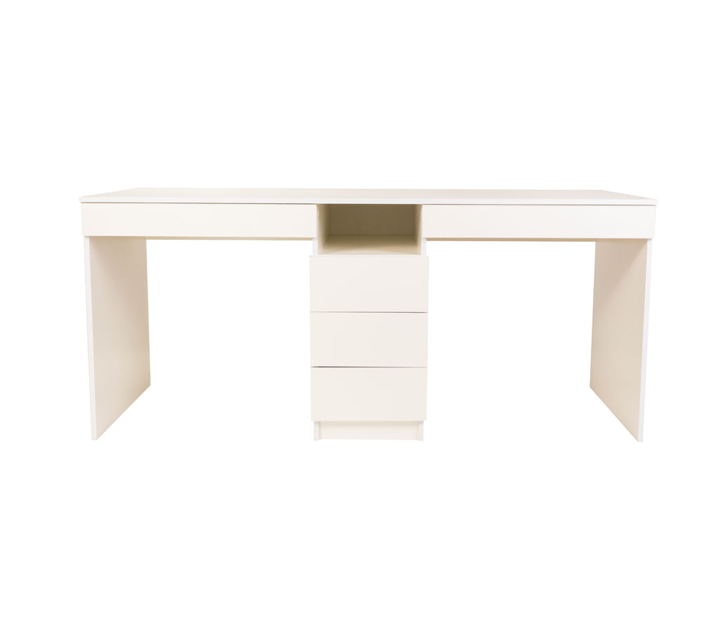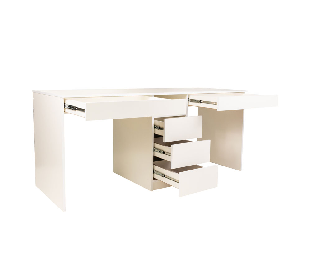 Имеется 3 вместительных ящика посередине на шариковых направляющих, а также под каждым рабочим местом.