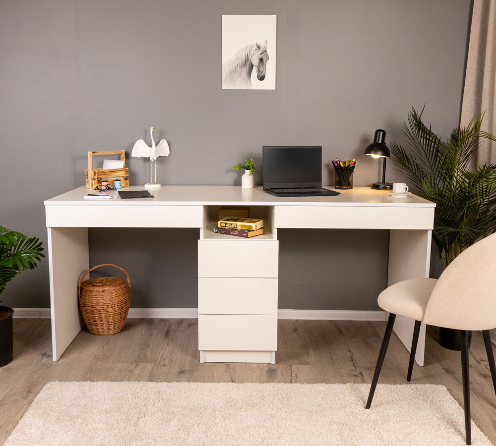 Классическая прямоугольная столешница позволяет разместить на ней все необходимые вещи, в том числе ноутбук, монитор, клавиатуру и настольную лампу.
