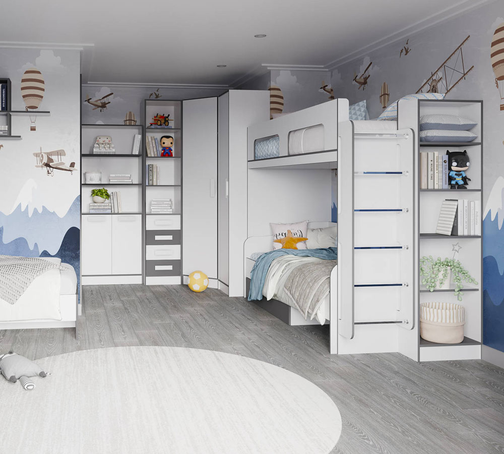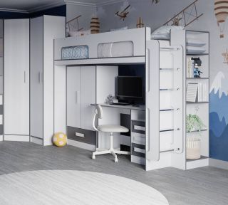 Кровать чердак спроектирована под одно спальное место и может дополняться вторым спальным местом (кровать с ящиками) или рабочим местом (шкаф малый, письменный стол) .