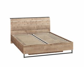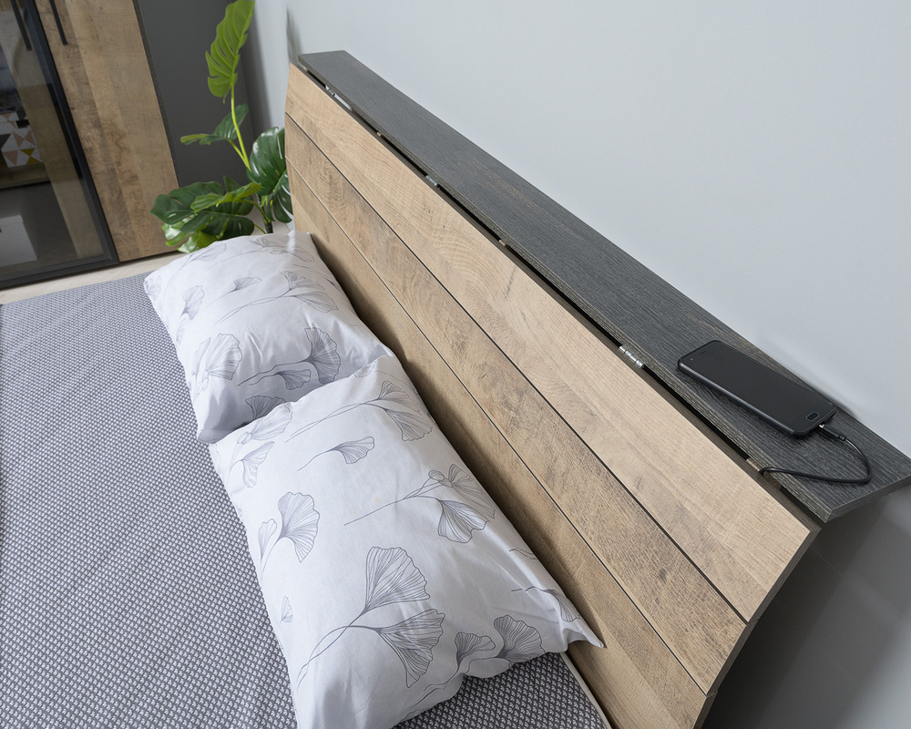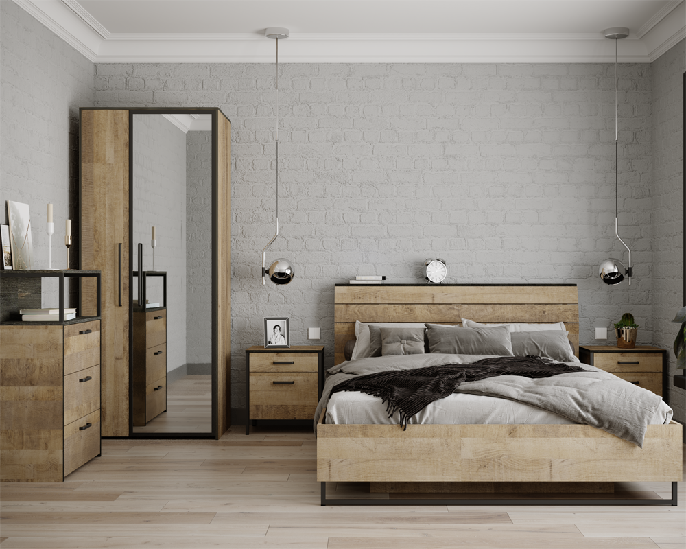Брутальная спальня в стиле лофт. Планкованное изголовье с изгибом — два варианта конфигурации: с полкой и без неё. Кровать может быть оснащена ортопедическим основанием с подъёмным механизмом, который открывает доступ к вместительному коробу для хранения.
