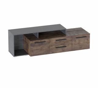 В центральной части располагаются два выдвижных ящика на шариковых направляющих, а по бокам расположены два отделения с полками и распашными дверями. Правая часть тумбы выполнена в виде надстройки и оснащено одной стеклянной полкой. Тумба комплектуется петлями с плавным закрыванием.